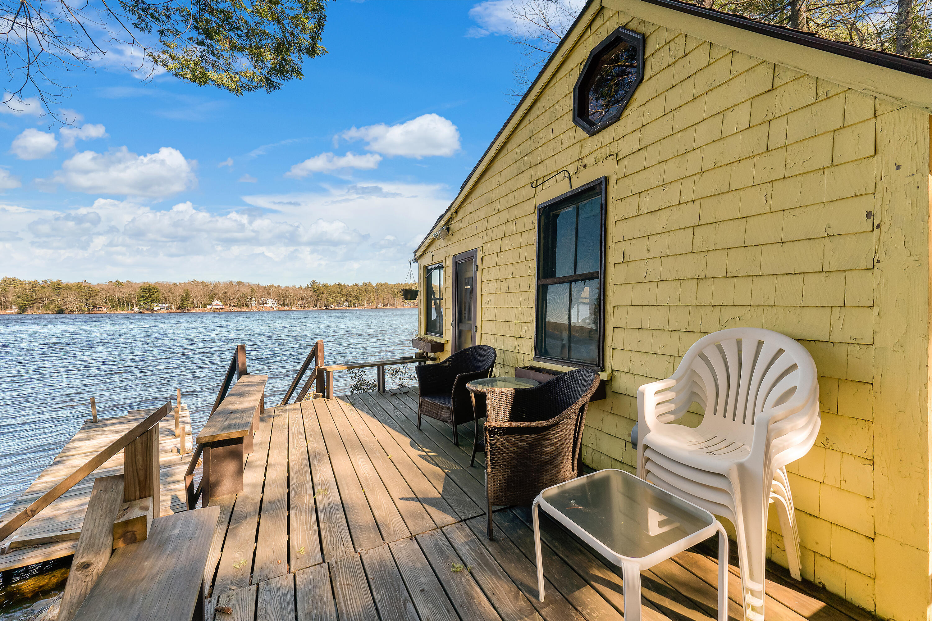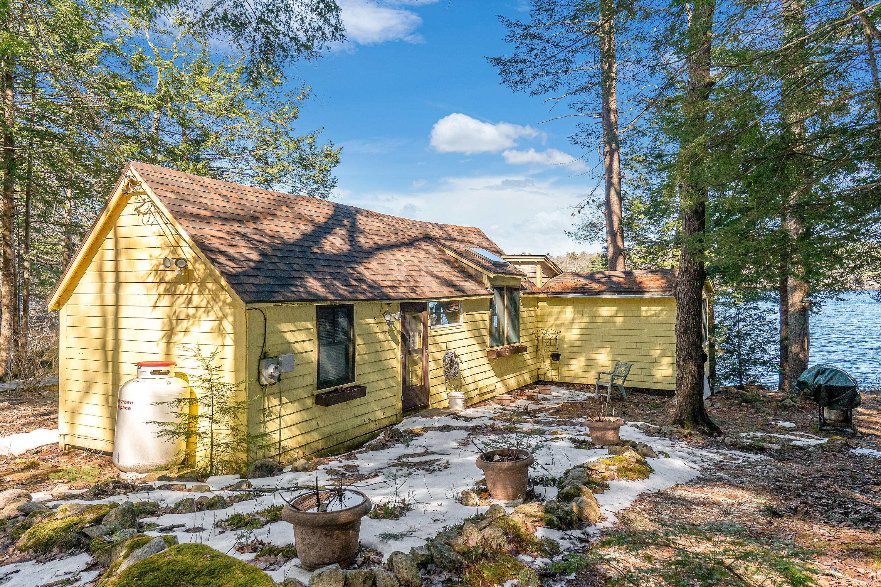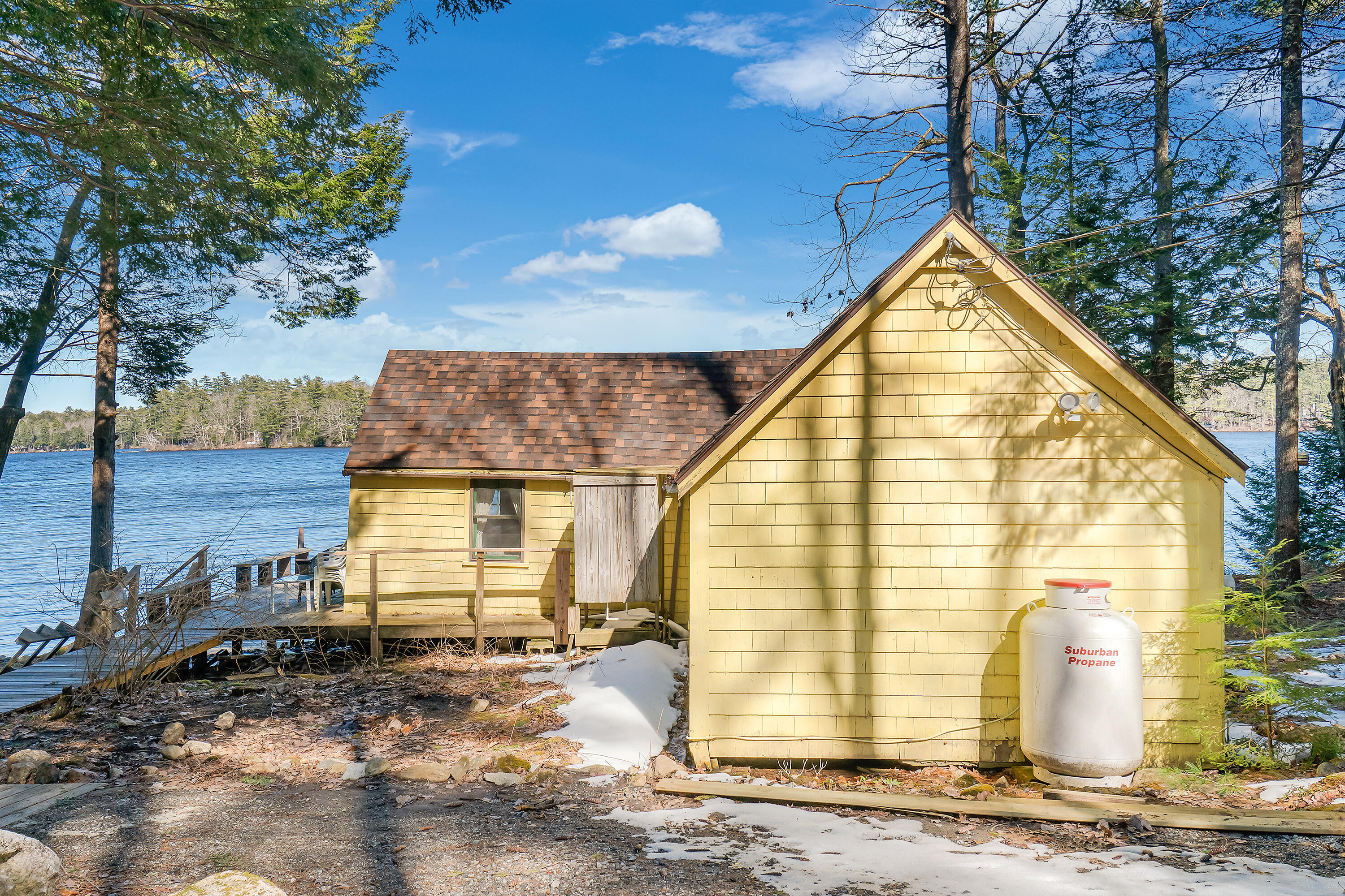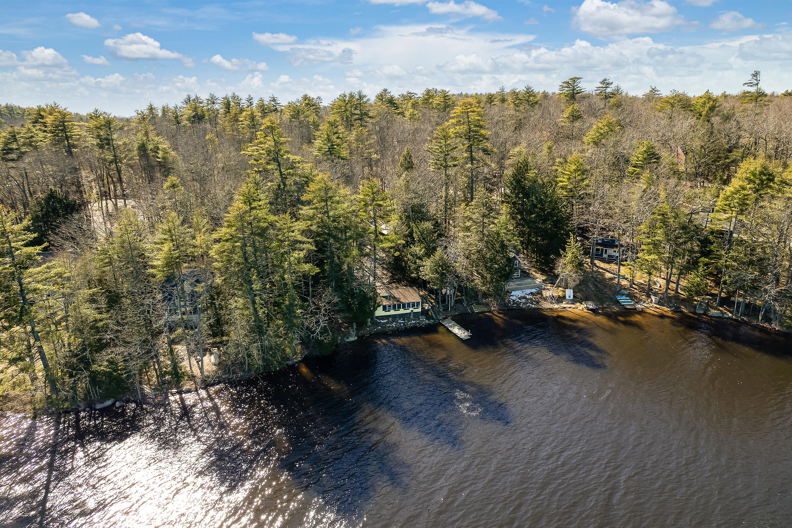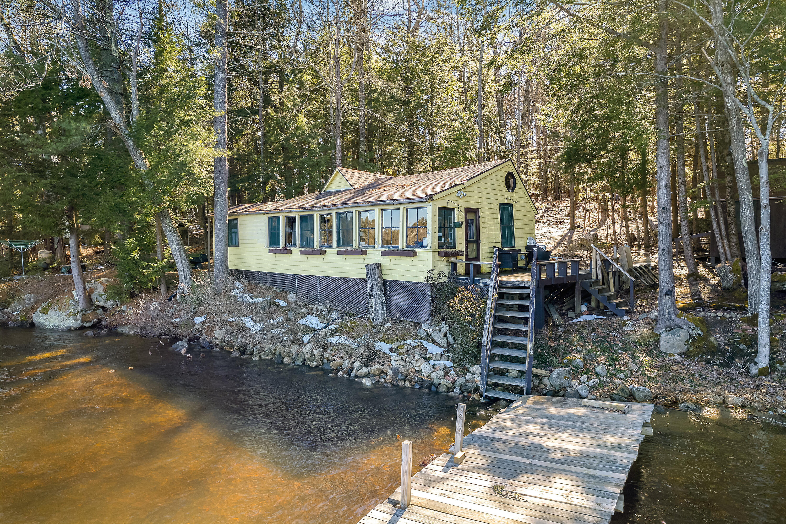 Adorable Maine Cottage on beautiful Highland Lake boasting a wall of windows on the water. Sip your coffee and listen to the loons. Turnkey as it stands, sold furnished so you can be on the water right away. Nestled into the pines on a king sized 1.3 acre lot with 178 (yes, 178!) feet of frontage, dock, enclosed outdoor shower, and sweet sandy swimming spot. Take advantage of the footprints of both the cottage and garage within the shoreland zone to renovate, expand, or rebuild. If you have been thinking of building but have been frustrated by the thought of building far back from the water, this could be the unicorn for which you have been looking. Move right in and enjoy the water and take your time to plan your new lake home.