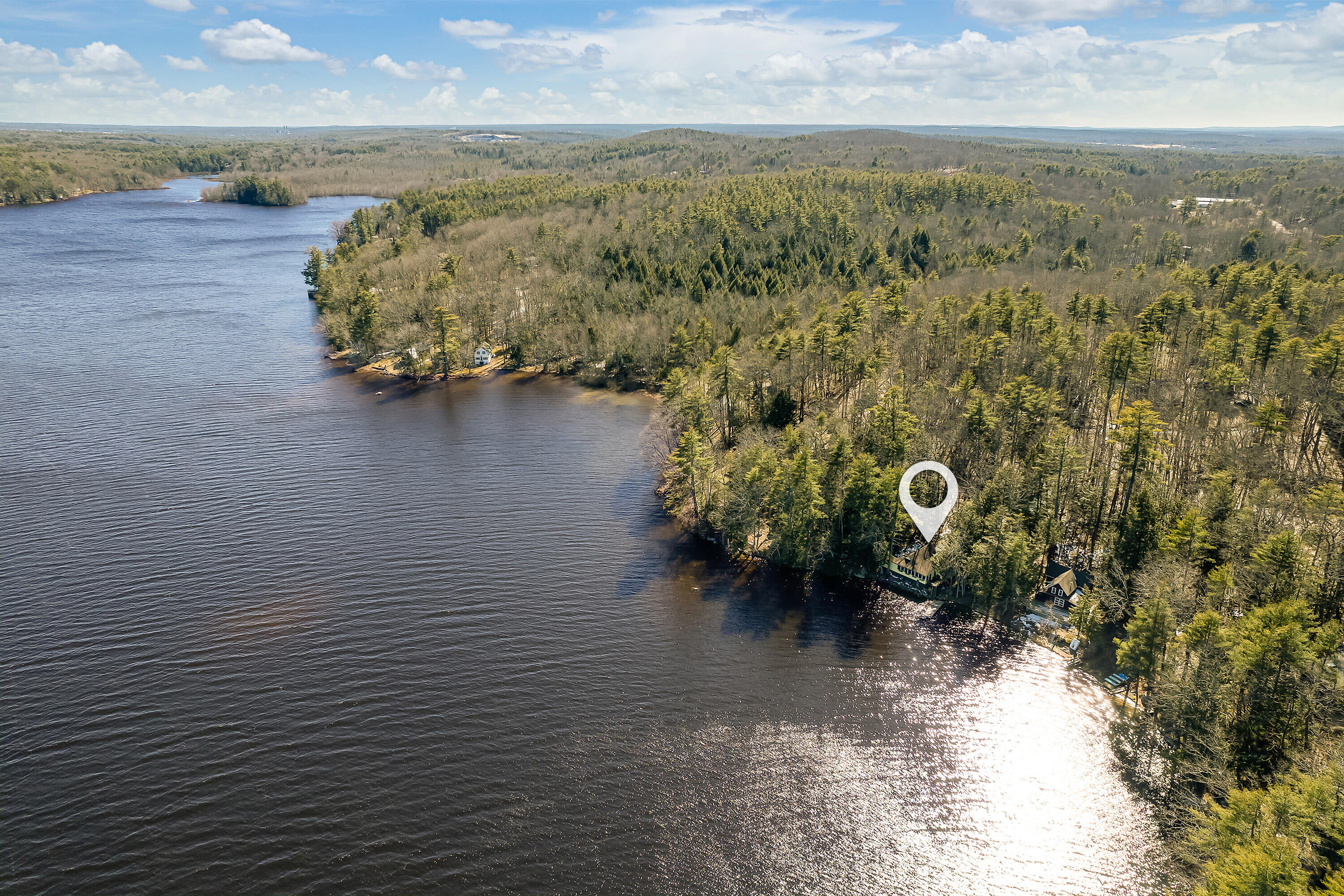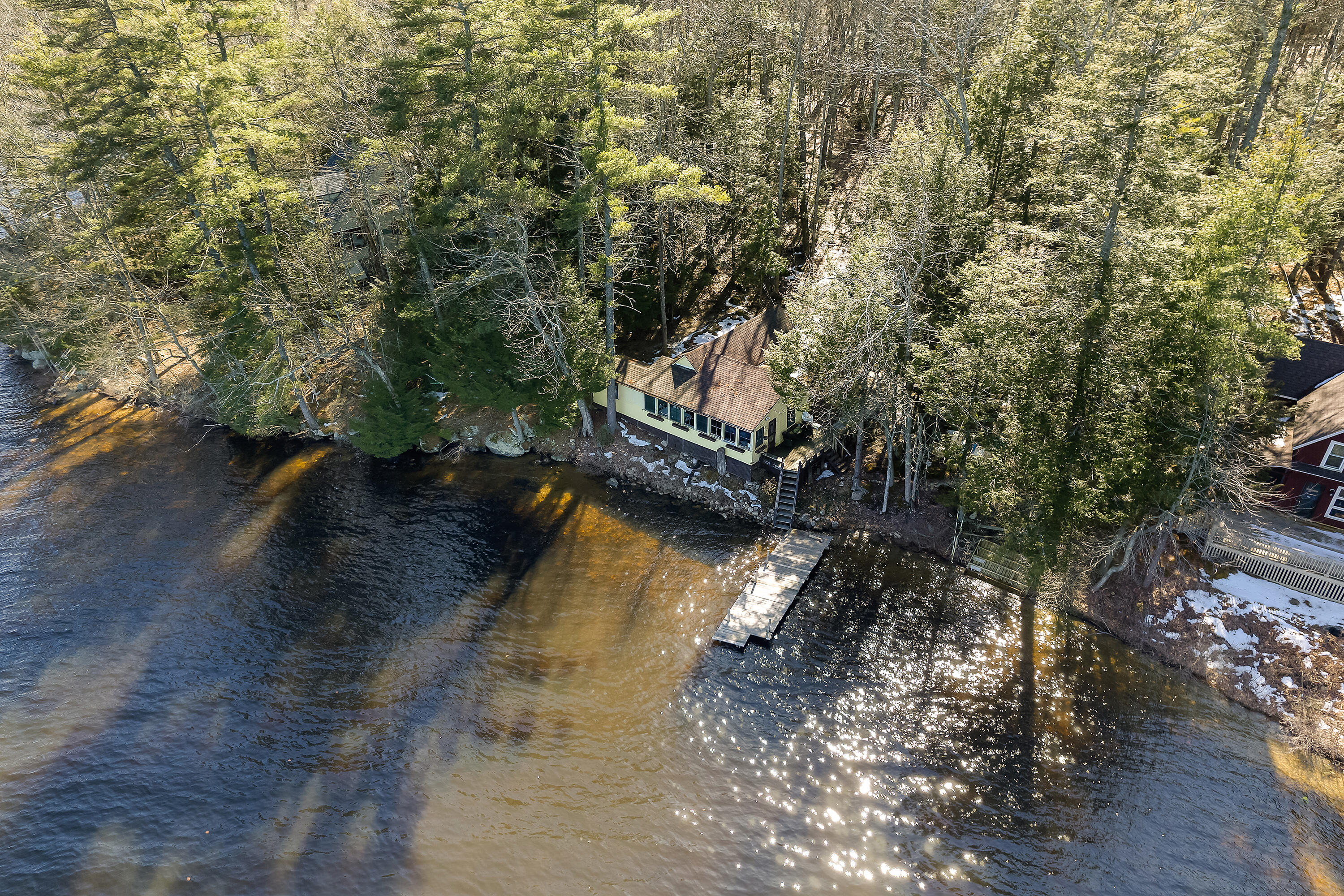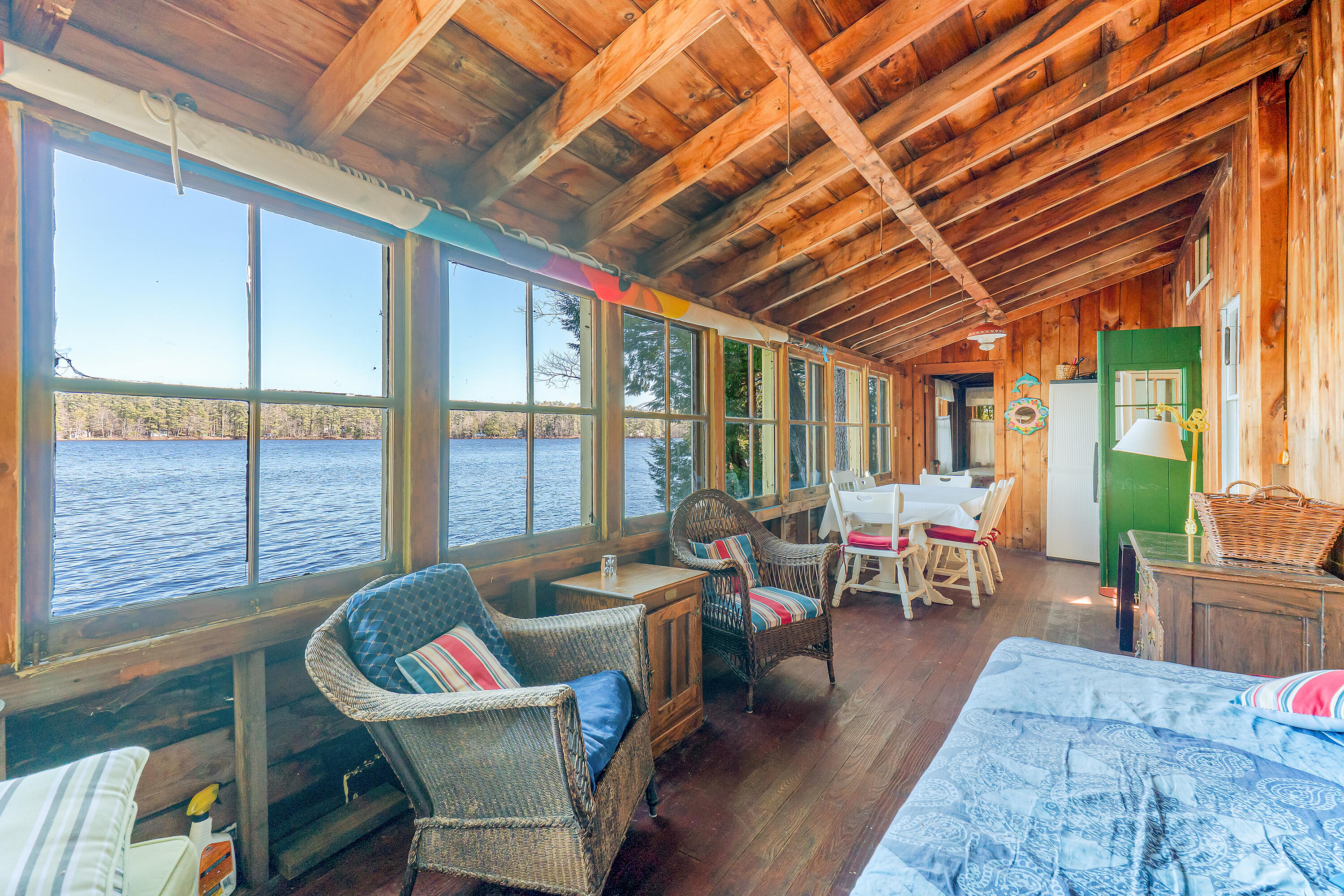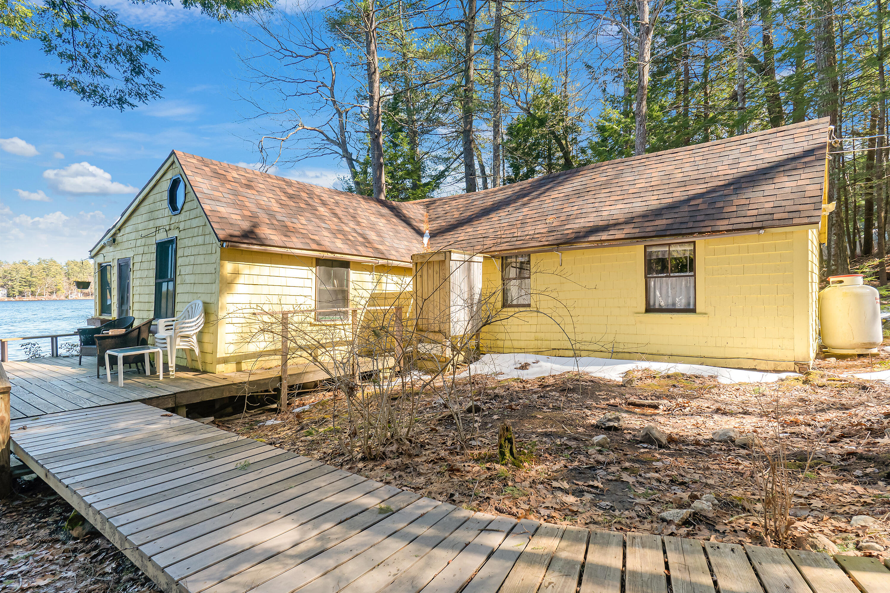 Adorable Maine Cottage on beautiful Highland Lake boasting a wall of windows on the water. Sip your coffee and listen to the loons. Turnkey as it stands, sold furnished so you can be on the water right away. Nestled into the pines on a king sized 1.3 acre lot with 178 (yes, 178!) feet of frontage, dock, enclosed outdoor shower, and sweet sandy swimming spot. Take advantage of the footprints of both the cottage and garage within the shoreland zone to renovate, expand, or rebuild. If you have been thinking of building but have been frustrated by the thought of building far back from the water, this could be the unicorn for which you have been looking. Move right in and enjoy the water and take your time to plan your new lake home.