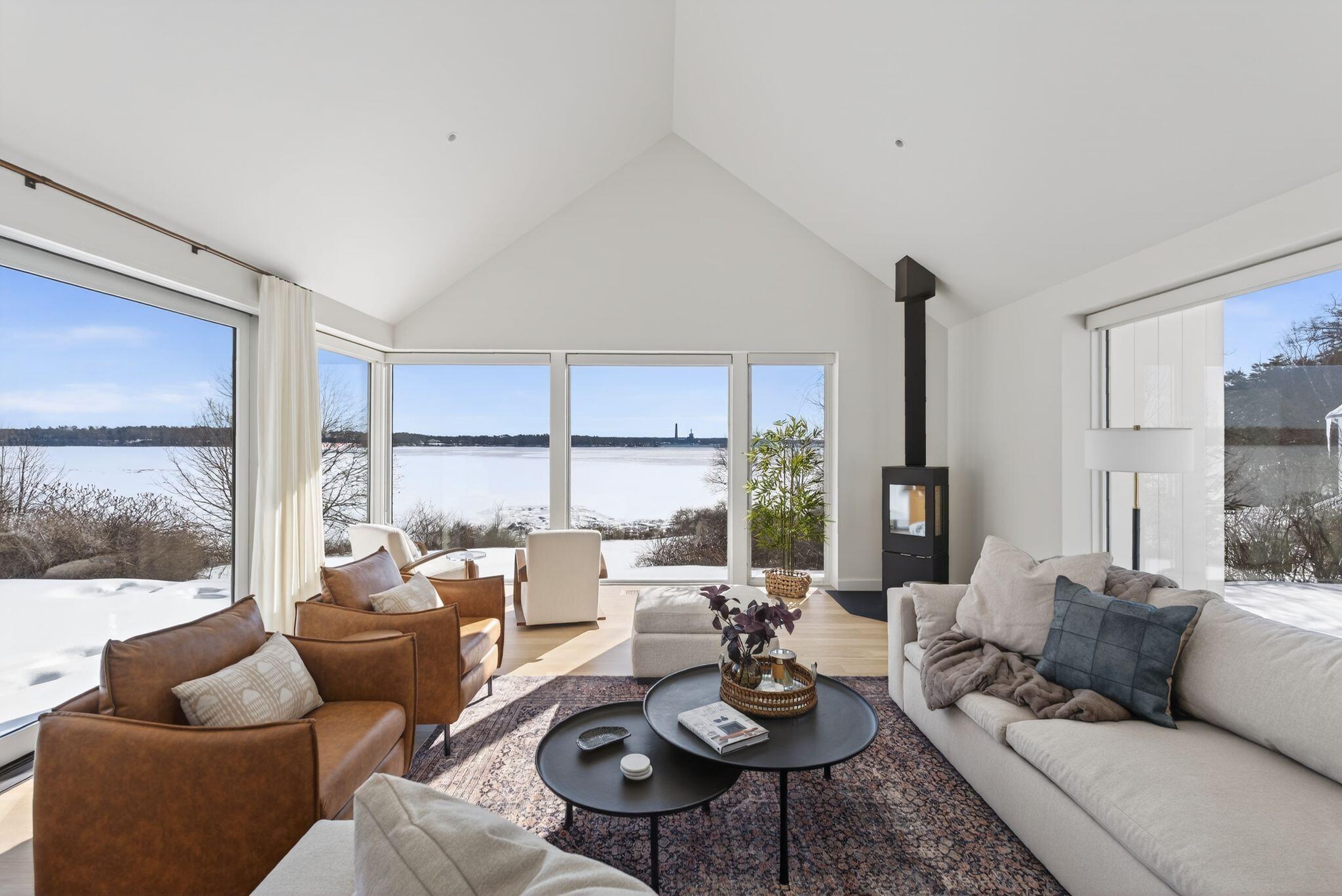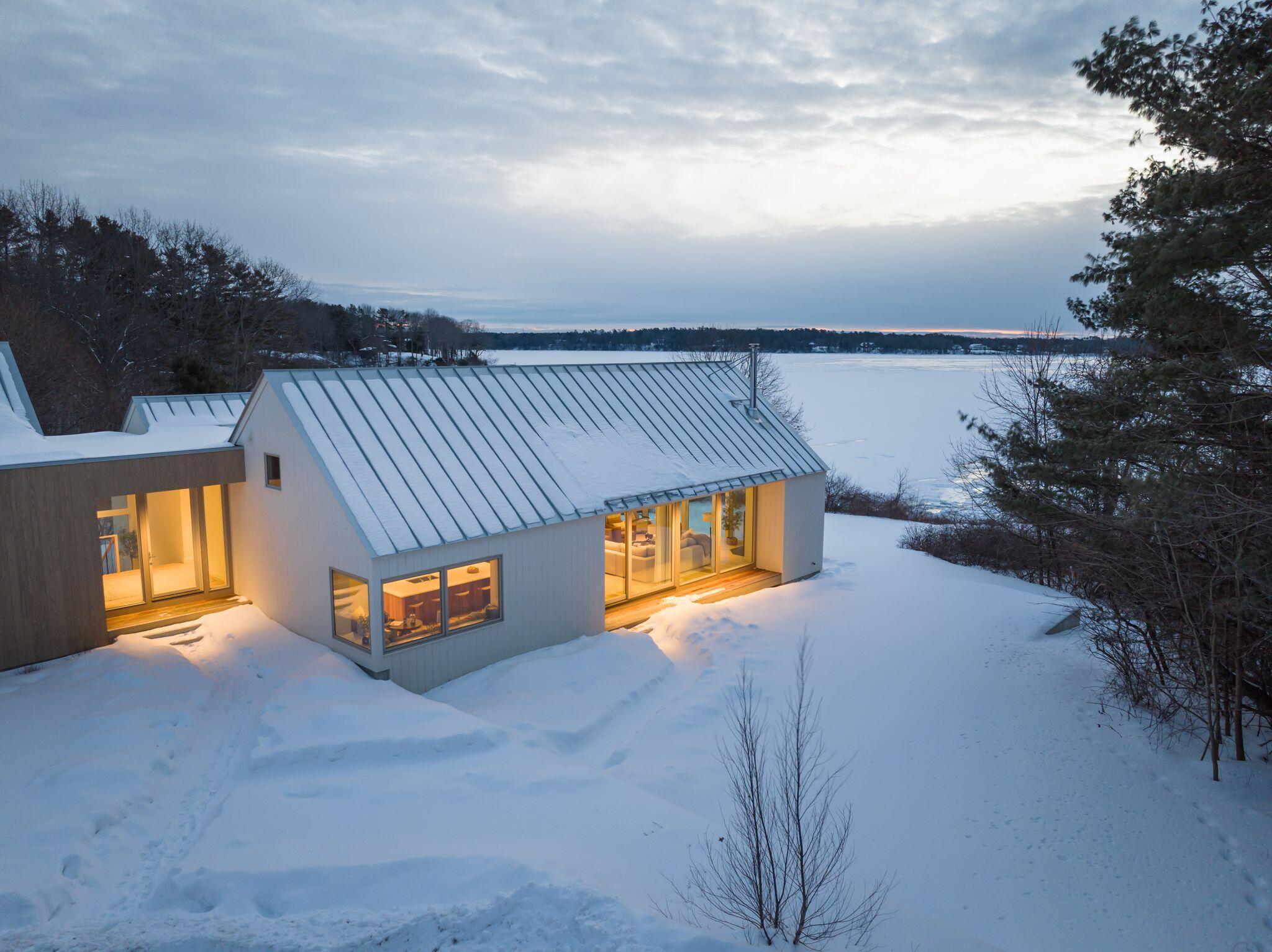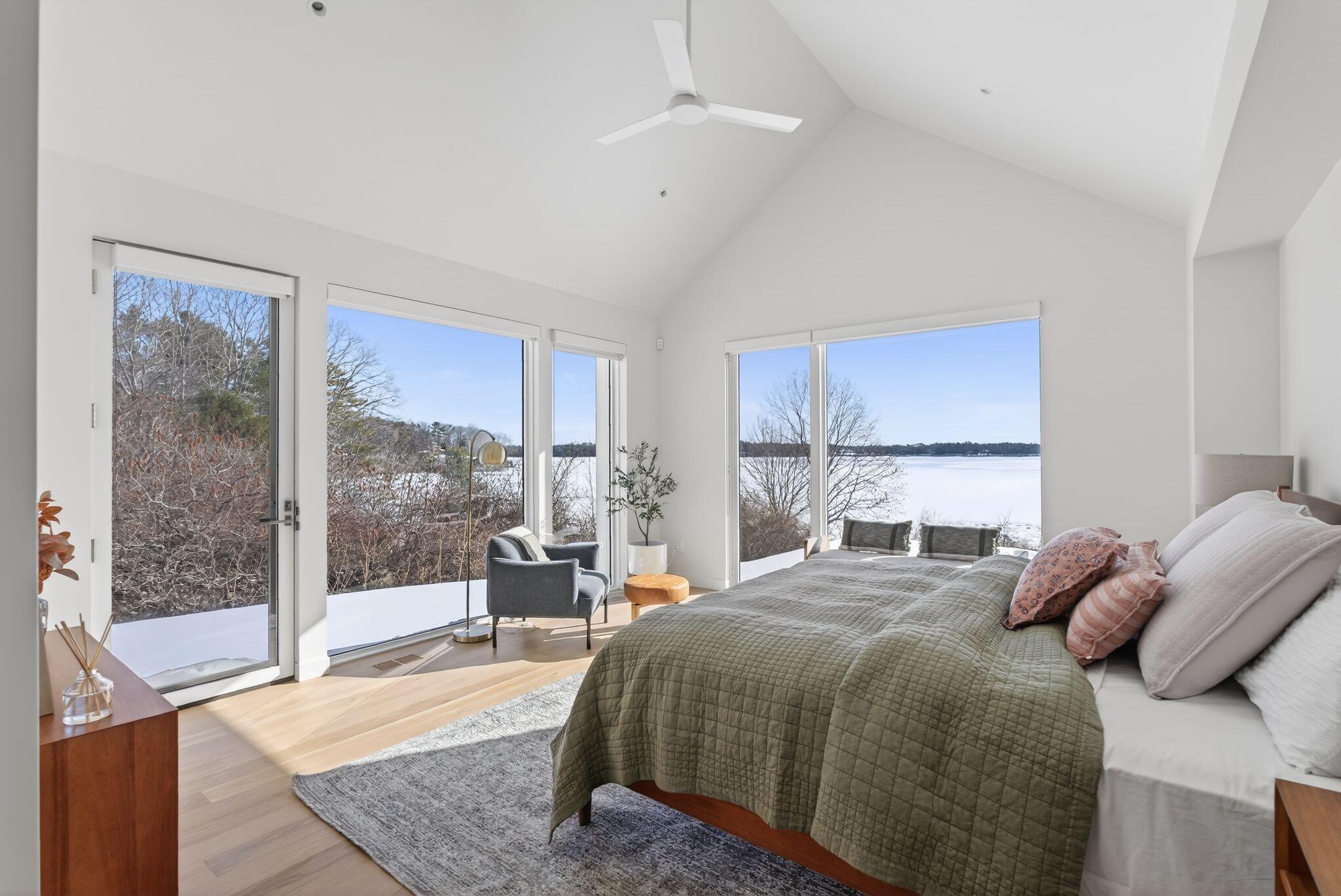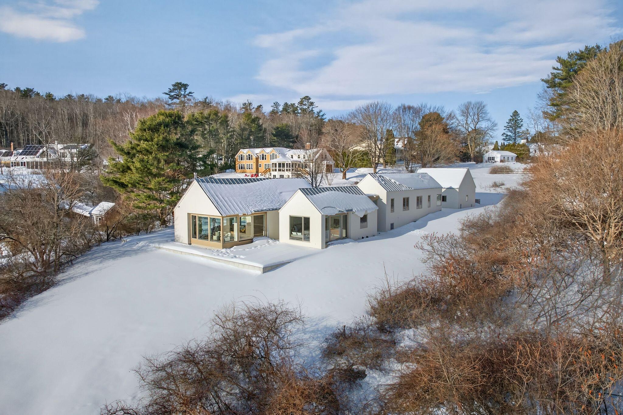 Newly completed in 2025, a collaboration between architect Jessie Carroll and Bowley Builders, this striking contemporary residence pairs sleek modern design with the quiet beauty of the Maine coastline. Set amid natural surroundings with 155 feet of Casco Bay water frontage, the home invites ocean air and beautiful views into your everyday enjoyment. Floor-to-ceiling windows define the open concept interior, welcoming the morning sun and creating an ideal setting for unhurried coffee and coastal reflection. A palette of glistening white finishes enhances the sense of light and luxury while offering a refined canvas for personal expression. Soaring ceilings and four generously sized bedrooms include a primary suite with water views and a private spa like bath. The kitchen is both sleek and functional, centered around a statement island and framed by wall-to-wall cabinetry with glass accents, while a corner breakfast nook adds warmth and effortless gathering space. Designed for year round enjoyment, the home balances modern elegance with comfort and convenience, just moments from Foreside amenities and local dining and entertainment.