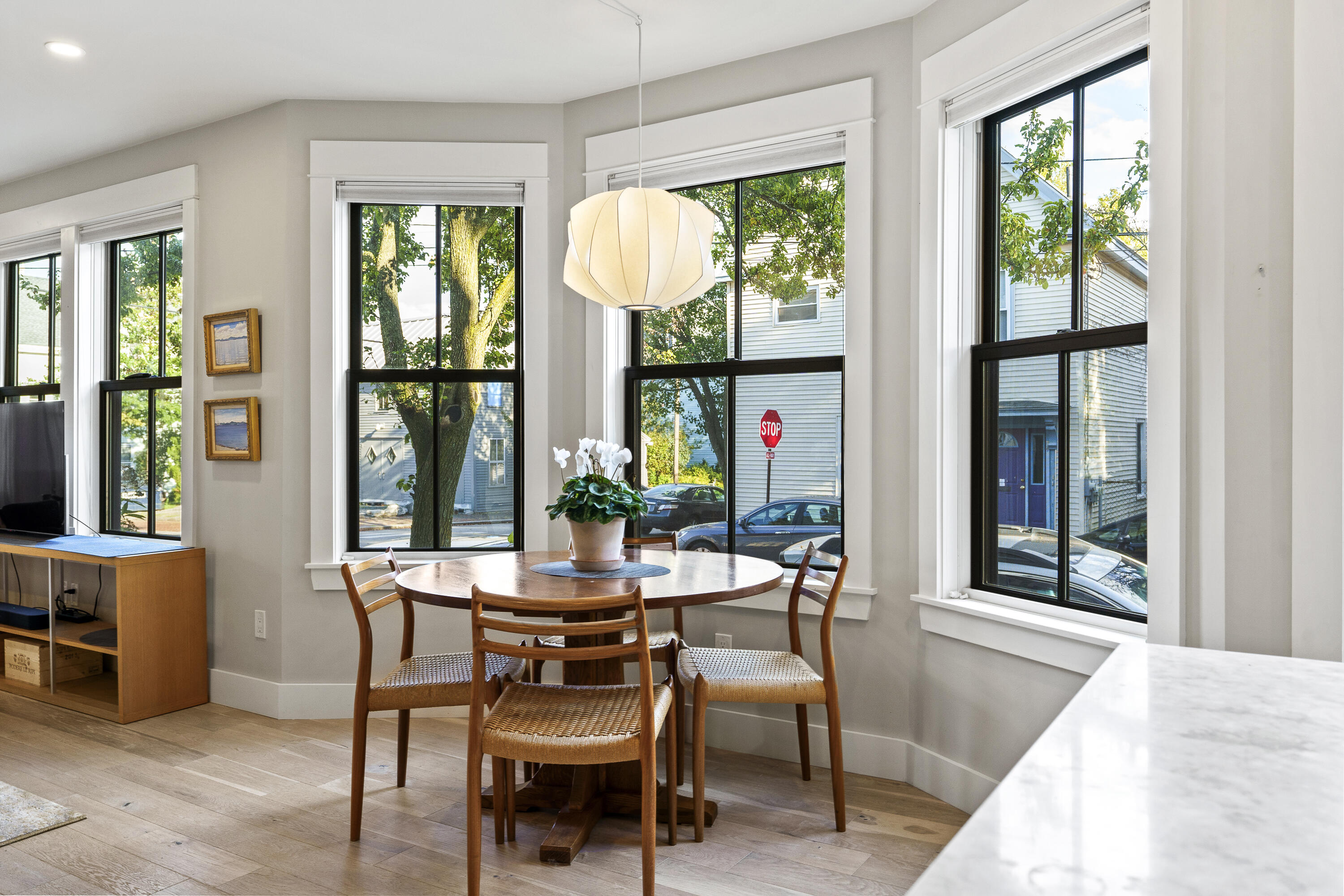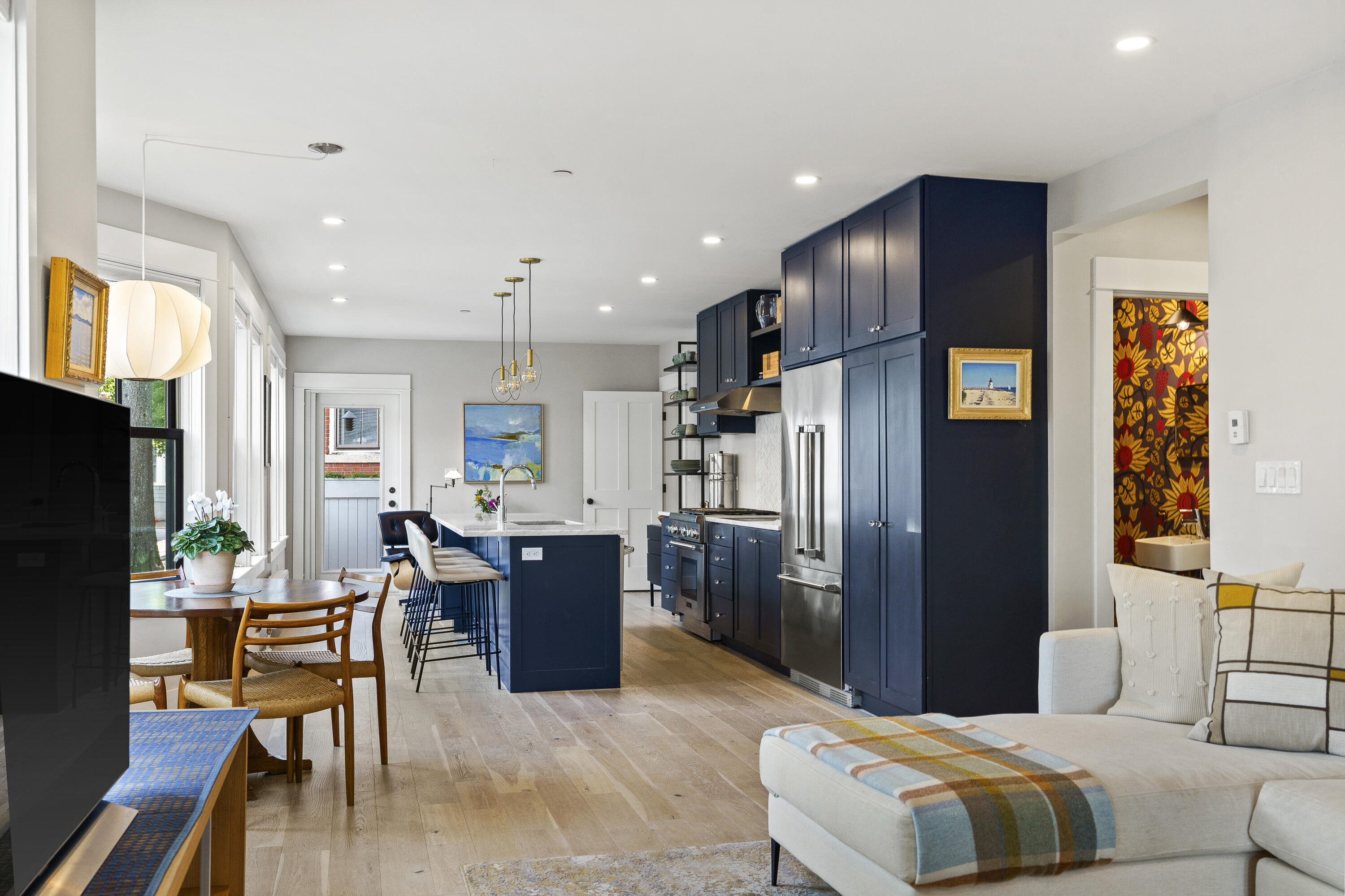Gracing the top of Munjoy Hill, this condo offers a connection to the city's most beloved amenities and a lifestyle both refined and coastal. It is just moments from celebrated restaurants, neighborhood cafes, the Eastern Promenade, and the sparkling waters of Casco Bay. Originally built with historic character and reimagined in 2018, this condominium balances preserved architectural details with high-end contemporary design. The sun-filled first-floor unit welcomes you with an open layout that connects the living, dining, and kitchen areas. A wall of windows brings in abundant natural light, while a private enclosed deck offers a peaceful outdoor retreat. The kitchen is both striking and functional, featuring rich blue cabinetry, open shelving, a herringbone tile backsplash, a large island with seating for four, and generous storage. Off the living room, pocket doors reveal a charming library nook with floor-to-ceiling bookshelves and a grand bowed window--a serene spot to read or unwind. The primary suite is a sanctuary with elegant wallpaper, deck access, and a spa-like ensuite bath. A second ensuite bedroom provides comfort and privacy for guests, while the powder room adds a designer touch with bold, modern wallpaper. Additional amenities include in-unit laundry, off-street parking, and a private storage area. Luxury, convenience, and timeless design converge in this distinctive Munjoy Hill home--an exceptional opportunity to experience Portland living at its finest.