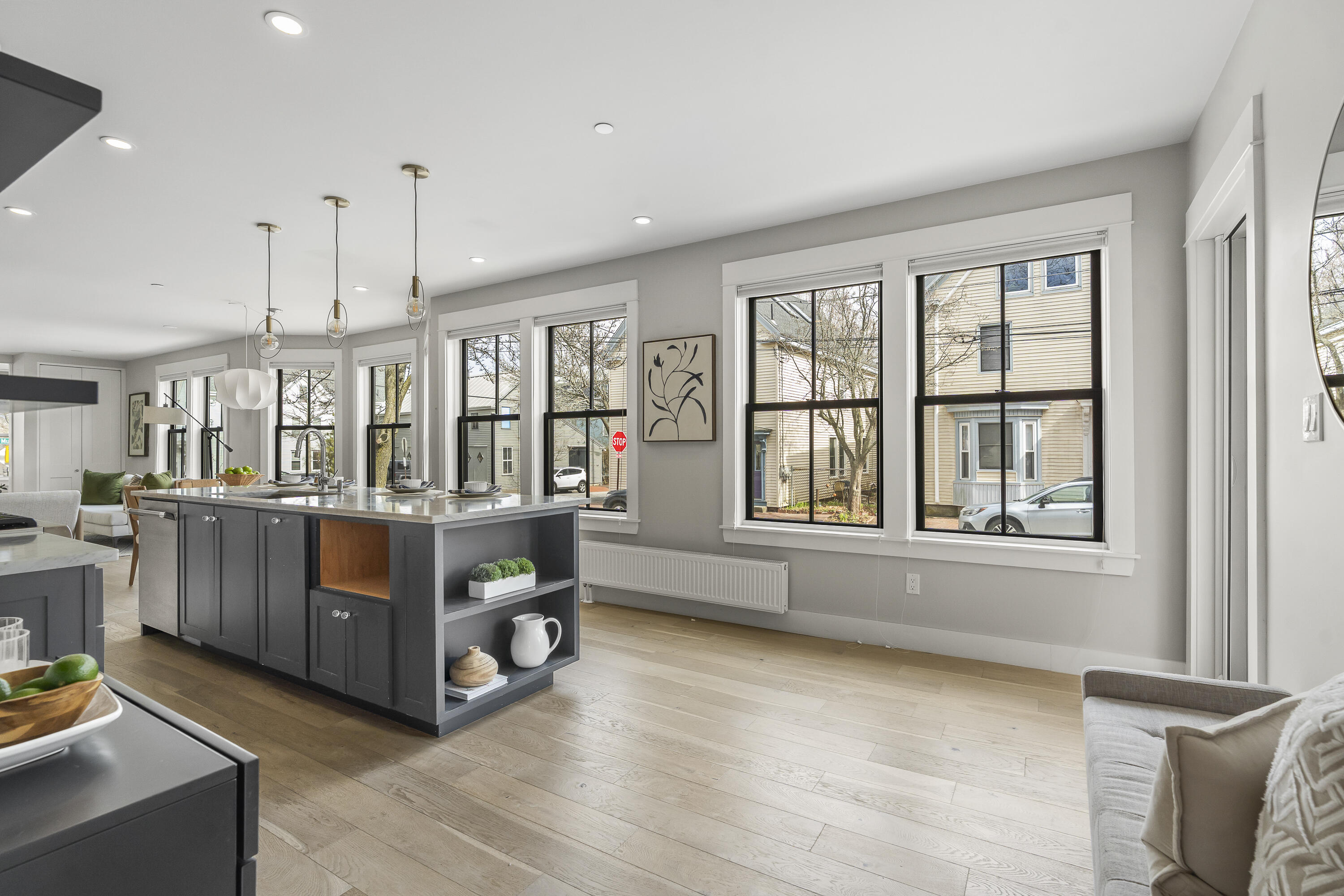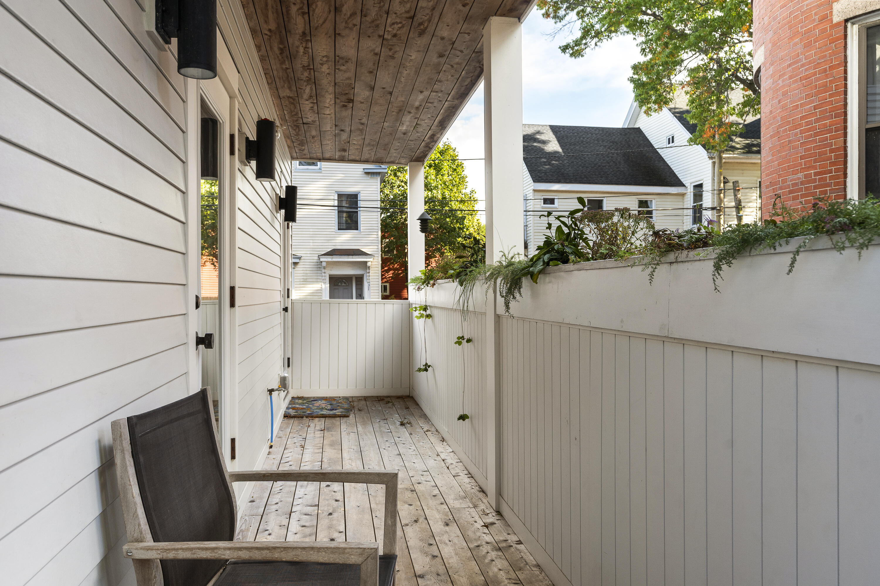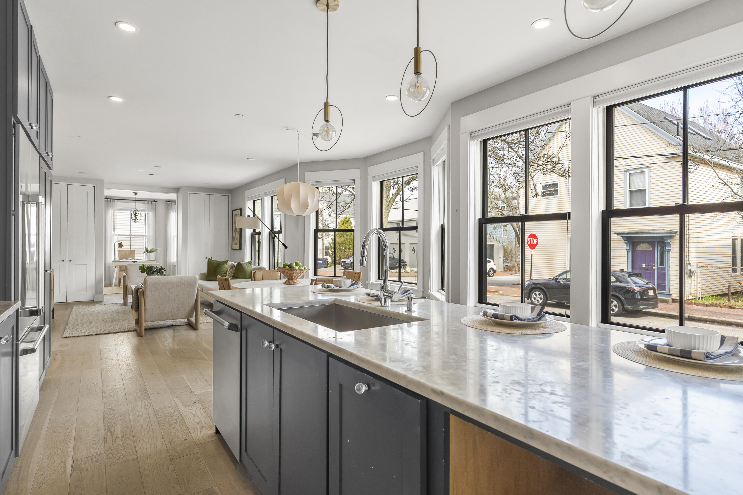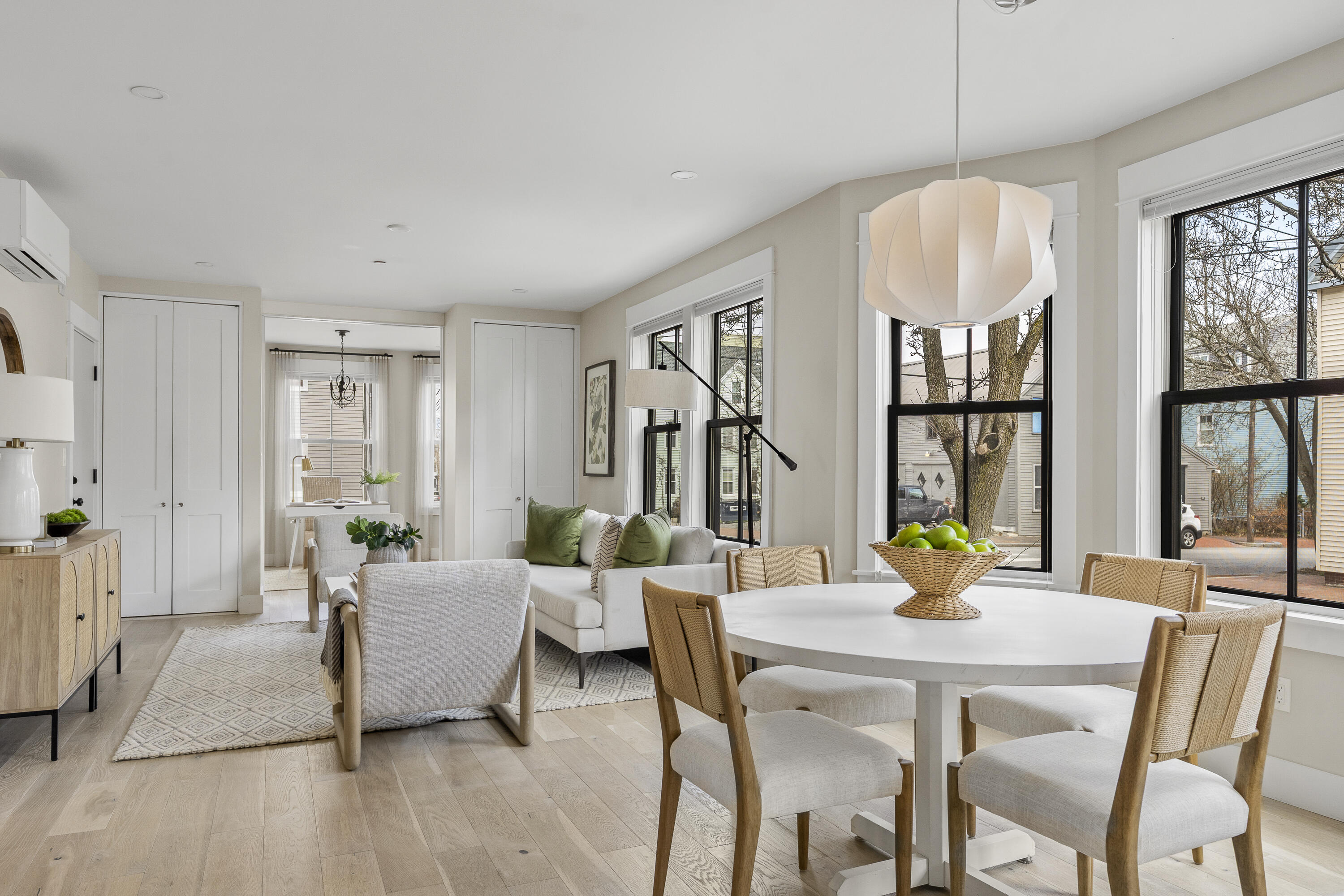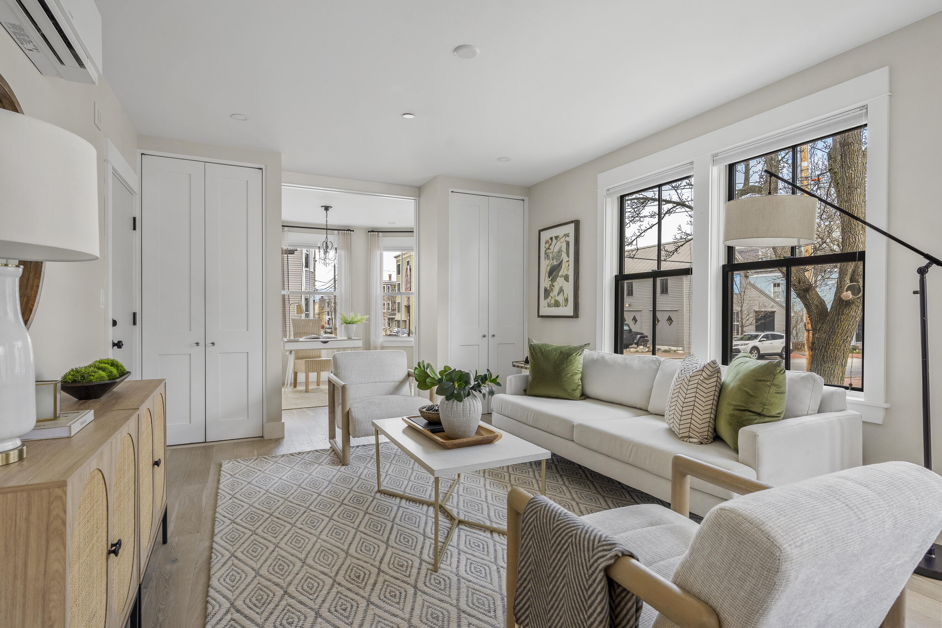 Gracing the top of Munjoy Hill, this condo offers a connection to the city's most beloved amenities and a lifestyle both refined and coastal. It is just moments from celebrated restaurants, neighborhood cafes, the Eastern Promenade, and the sparkling waters of Casco Bay. Originally built with historic character and reimagined in 2018, this condominium balances preserved architectural details with high-end contemporary design. The sun-filled first-floor unit welcomes you with an open layout that connects the living, dining, and kitchen areas. A wall of windows brings in abundant natural light, while a private enclosed deck offers a peaceful outdoor retreat. The kitchen is both striking and functional, featuring rich blue cabinetry, open shelving, a herringbone tile backsplash, a large island with seating for four, and generous storage. Off the living room, pocket doors reveal a charming library nook with floor-to-ceiling bookshelves and a grand bowed window--a serene spot to read or unwind. The primary suite is a sanctuary with elegant wallpaper, deck access, and a spa-like ensuite bath. A second ensuite bedroom provides comfort and privacy for guests, while the powder room adds a designer touch with bold, modern wallpaper. Additional amenities include in-unit laundry, dedicated & off-street parking, and a private storage area. Luxury, convenience, and timeless design converge in this distinctive Munjoy Hill home--an exceptional opportunity to experience Portland living at its finest.