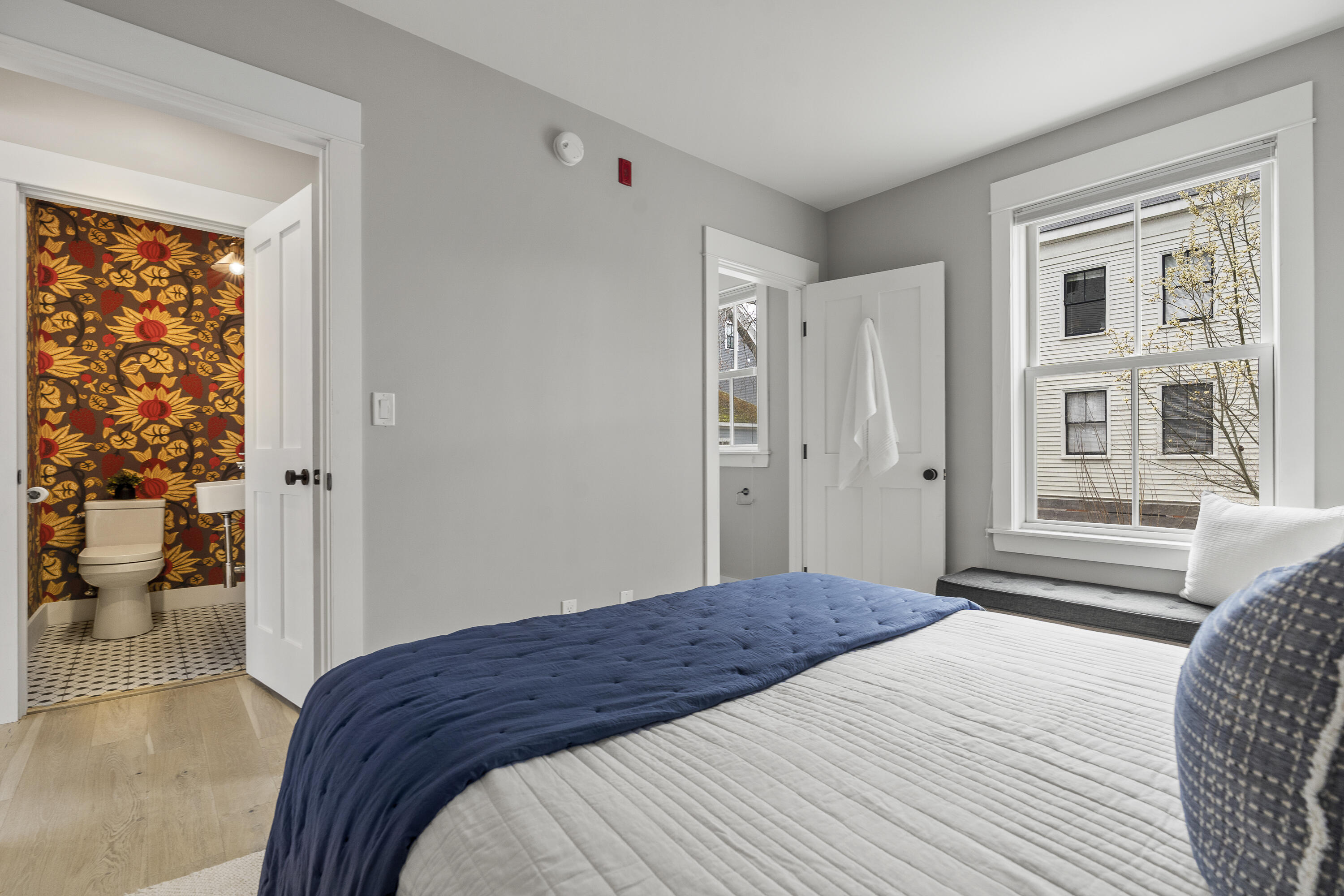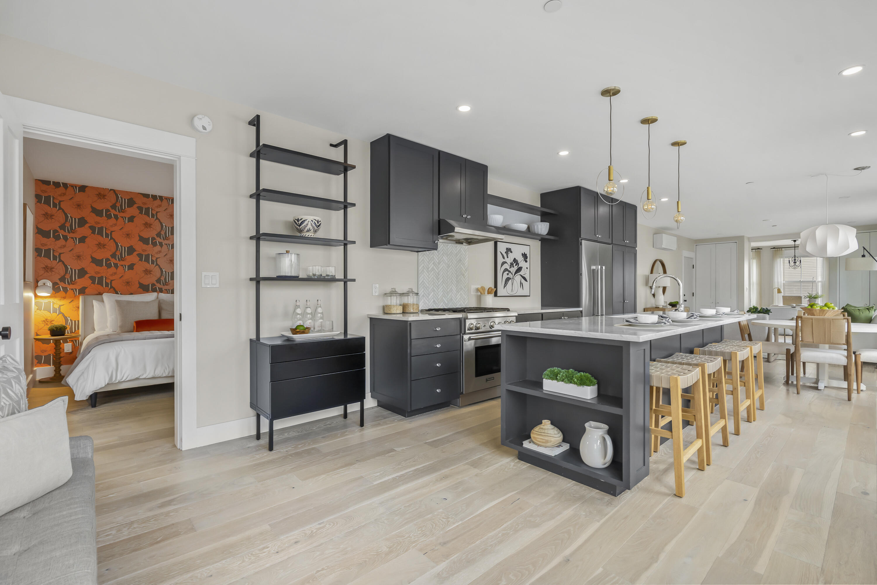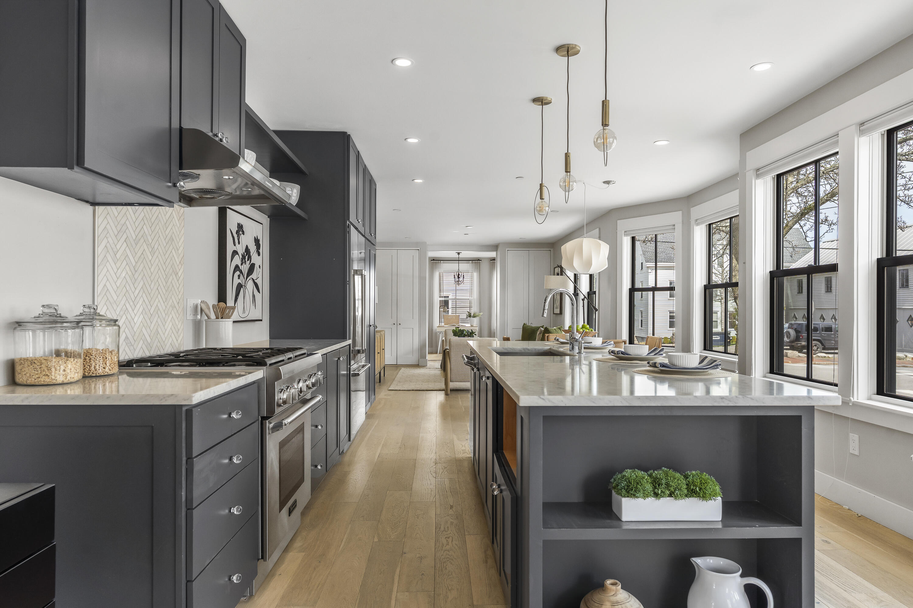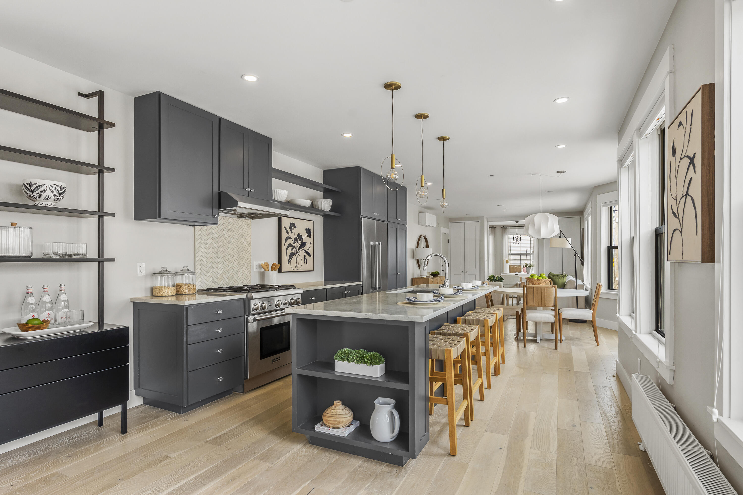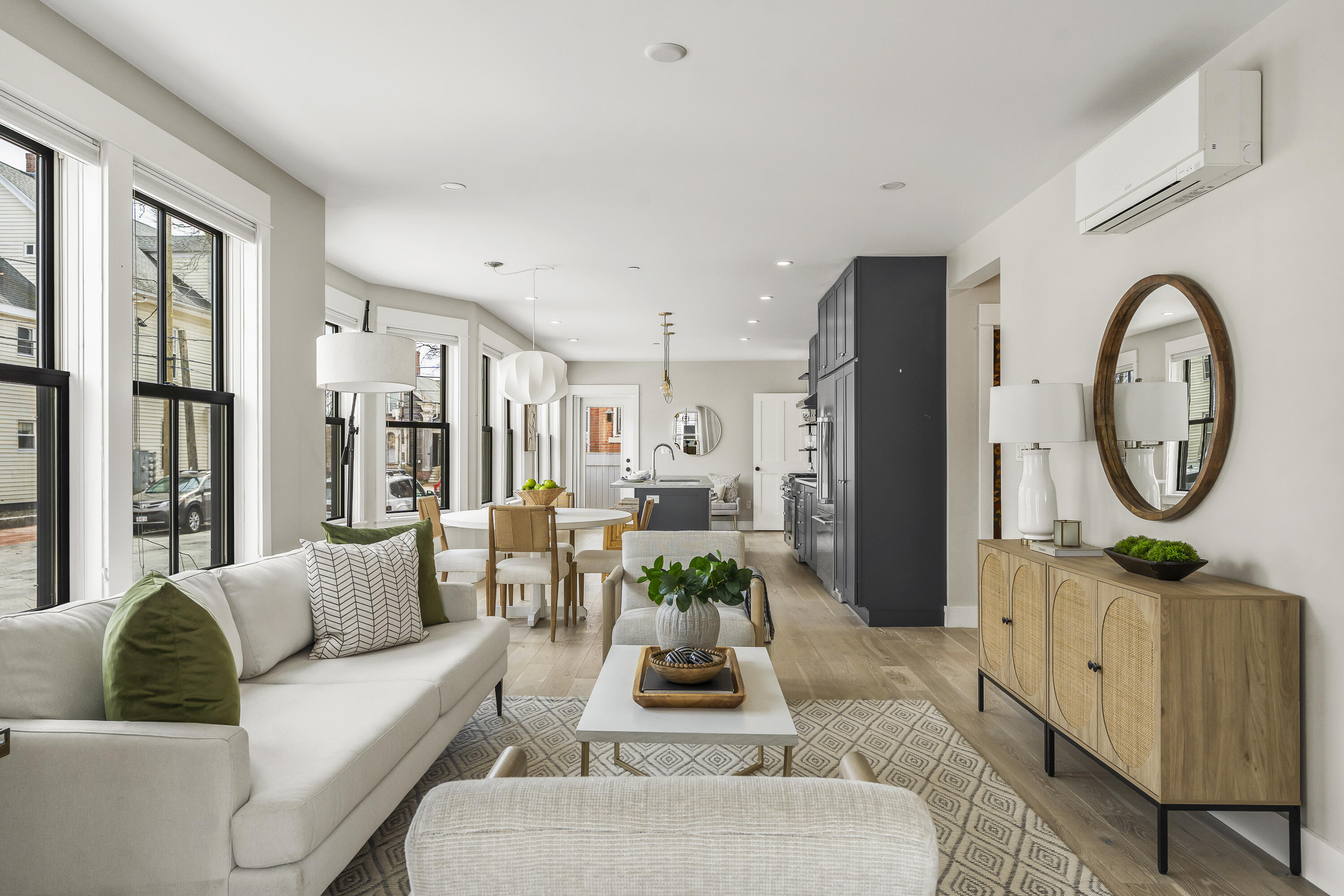 Gracing the top of Munjoy Hill, this condo offers a connection to the city's most beloved amenities and a lifestyle both refined and coastal. It is just moments from celebrated restaurants, neighborhood cafes, the Eastern Promenade, and the sparkling waters of Casco Bay. Originally built with historic character and reimagined in 2018, this condominium balances preserved architectural details with high-end contemporary design. The sun-filled first-floor unit welcomes you with an open layout that connects the living, dining, and kitchen areas. A wall of windows brings in abundant natural light, while a private enclosed deck offers a peaceful outdoor retreat. The kitchen is both striking and functional, featuring rich blue cabinetry, open shelving, a herringbone tile backsplash, a large island with seating for four, and generous storage. Off the living room, pocket doors reveal a charming library nook with floor-to-ceiling bookshelves and a grand bowed window--a serene spot to read or unwind. The primary suite is a sanctuary with elegant wallpaper, deck access, and a spa-like ensuite bath. A second ensuite bedroom provides comfort and privacy for guests, while the powder room adds a designer touch with bold, modern wallpaper. Additional amenities include in-unit laundry, dedicated & off-street parking, and a private storage area. Luxury, convenience, and timeless design converge in this distinctive Munjoy Hill home--an exceptional opportunity to experience Portland living at its finest.