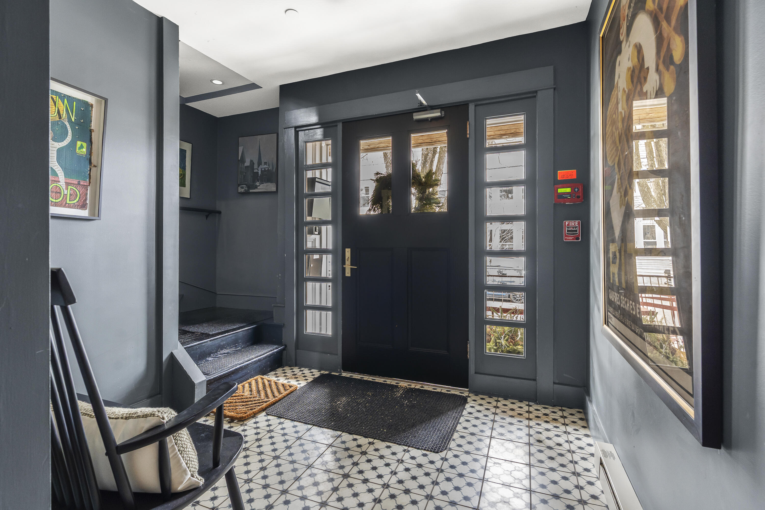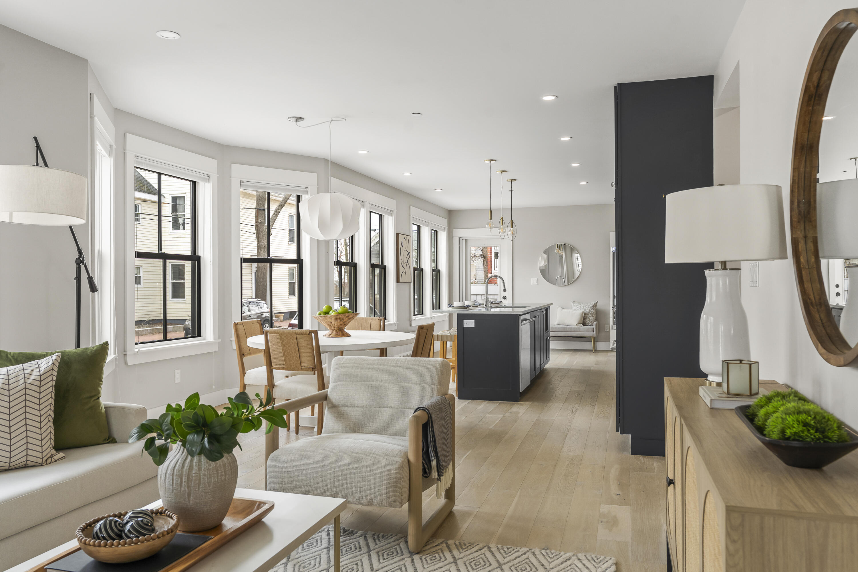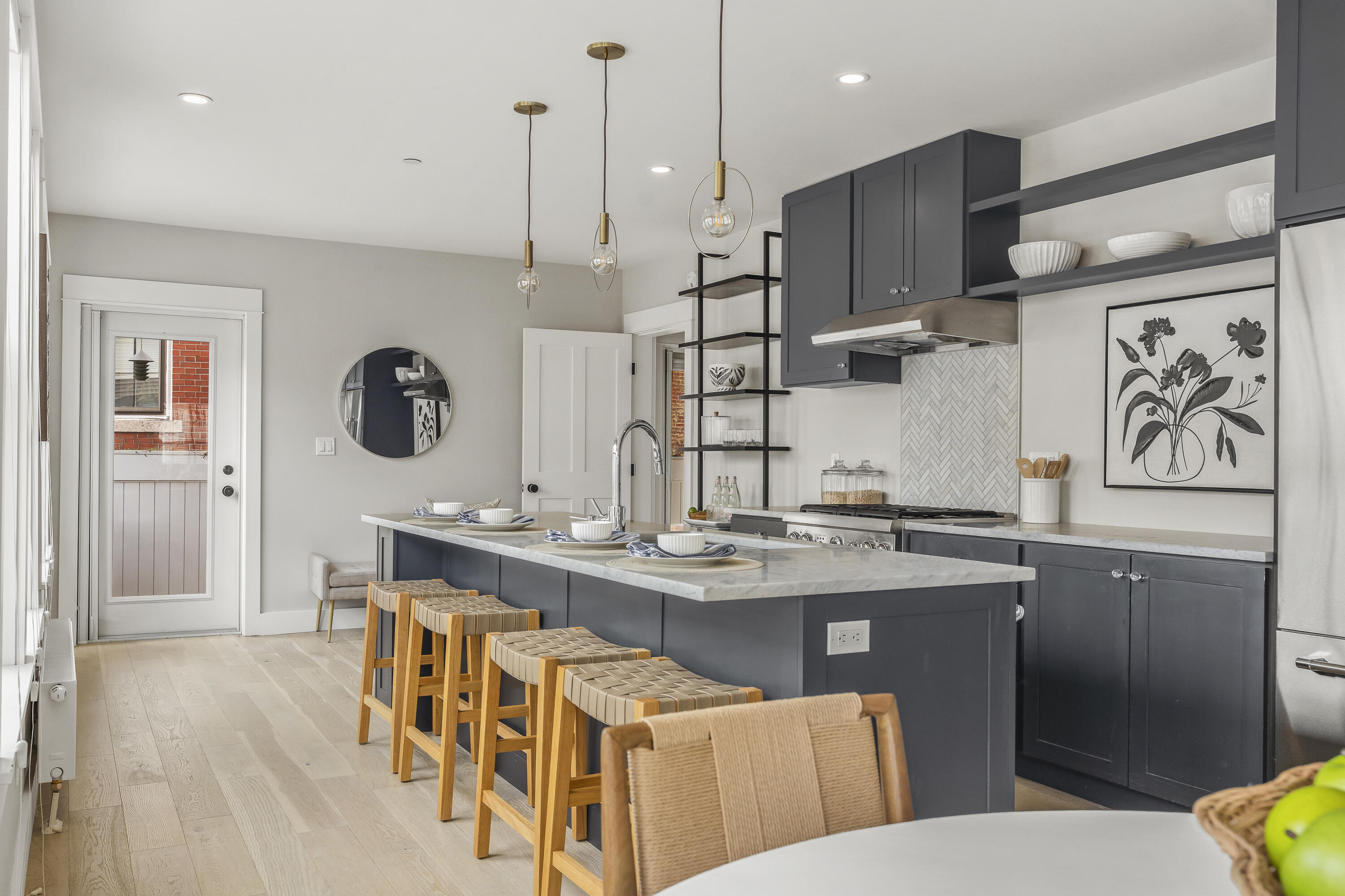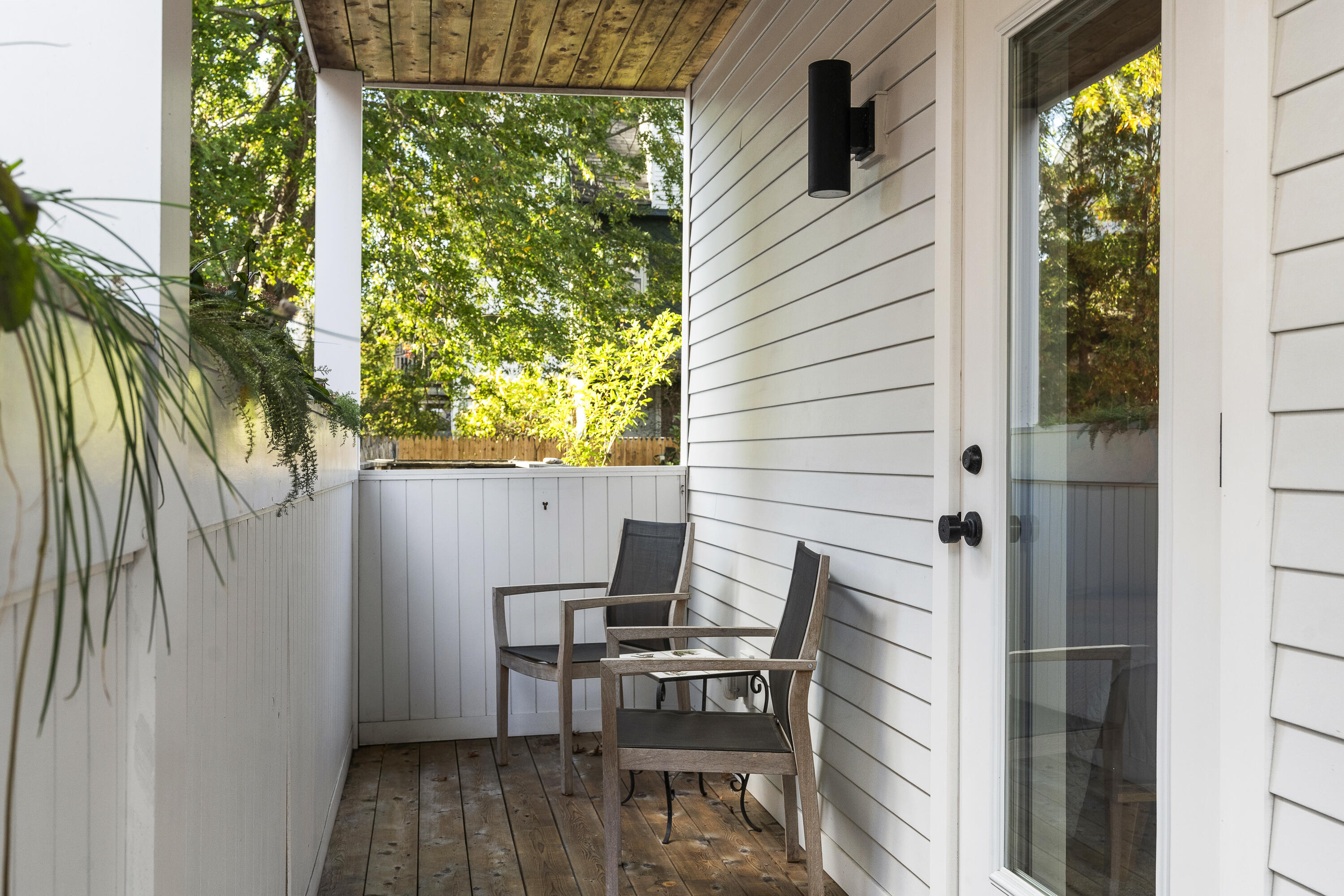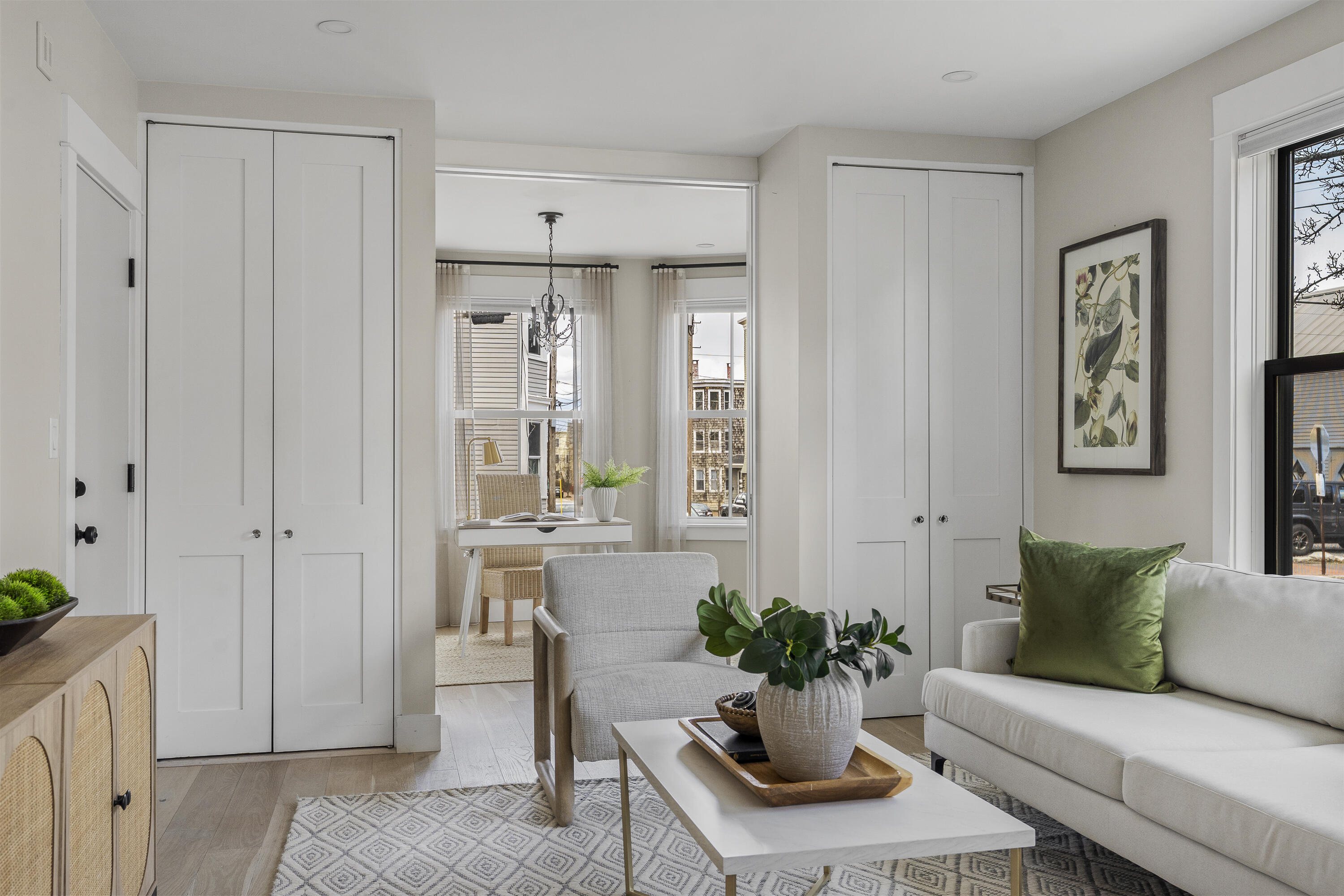 Gracing the top of Munjoy Hill, this condo offers a connection to the city's most beloved amenities and a lifestyle both refined and coastal. It is just moments from celebrated restaurants, neighborhood cafes, the Eastern Promenade, and the sparkling waters of Casco Bay. Originally built with historic character and reimagined in 2018, this condominium balances preserved architectural details with high-end contemporary design. The sun-filled first-floor unit welcomes you with an open layout that connects the living, dining, and kitchen areas. A wall of windows brings in abundant natural light, while a private enclosed deck offers a peaceful outdoor retreat. The kitchen is both striking and functional, featuring rich blue cabinetry, open shelving, a herringbone tile backsplash, a large island with seating for four, and generous storage. Off the living room, pocket doors reveal a charming library nook with floor-to-ceiling bookshelves and a grand bowed window--a serene spot to read or unwind. The primary suite is a sanctuary with elegant wallpaper, deck access, and a spa-like ensuite bath. A second ensuite bedroom provides comfort and privacy for guests, while the powder room adds a designer touch with bold, modern wallpaper. Additional amenities include in-unit laundry, dedicated & off-street parking, and a private storage area. Luxury, convenience, and timeless design converge in this distinctive Munjoy Hill home--an exceptional opportunity to experience Portland living at its finest.