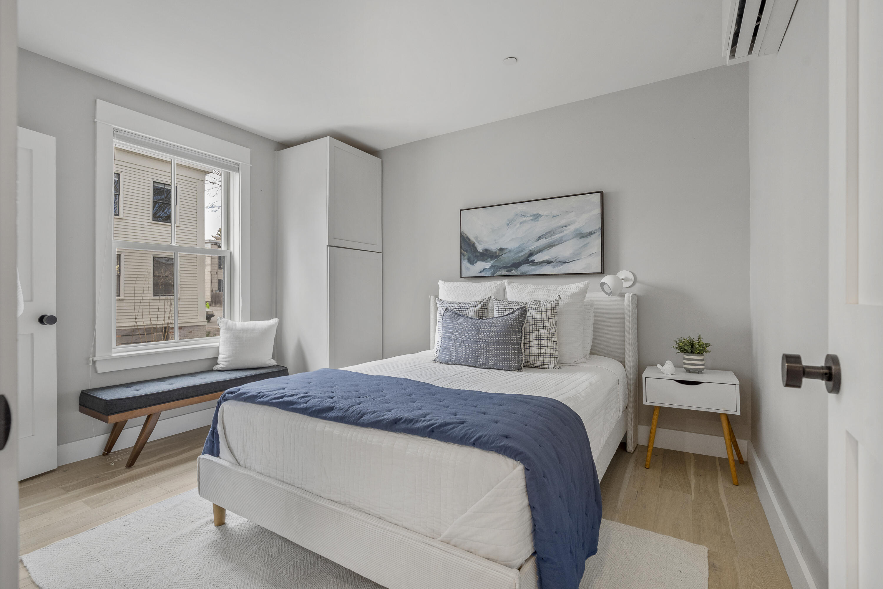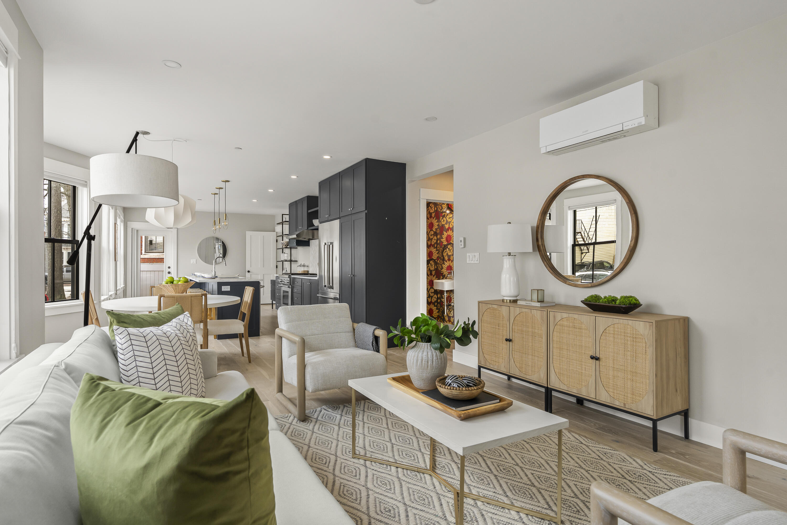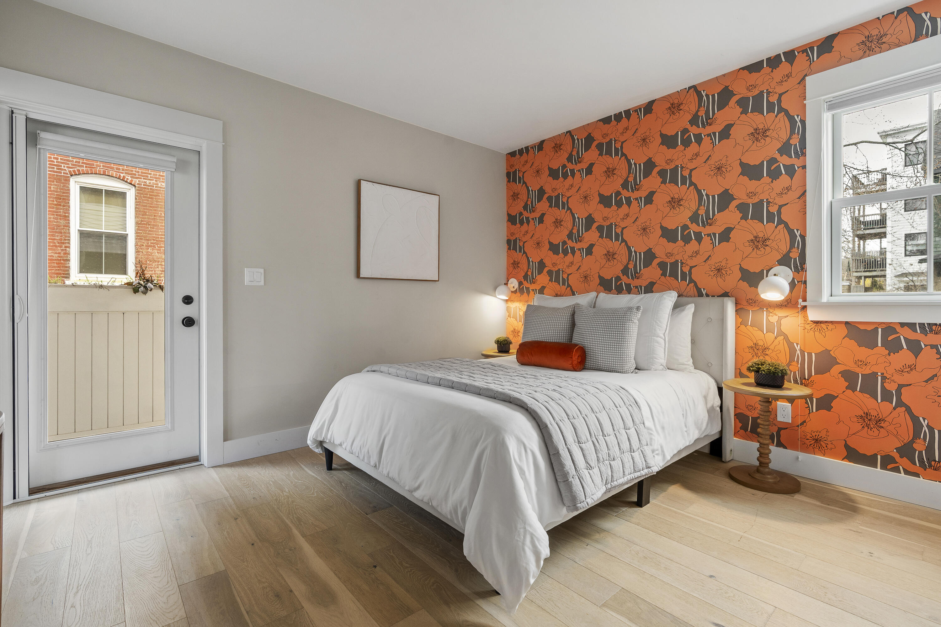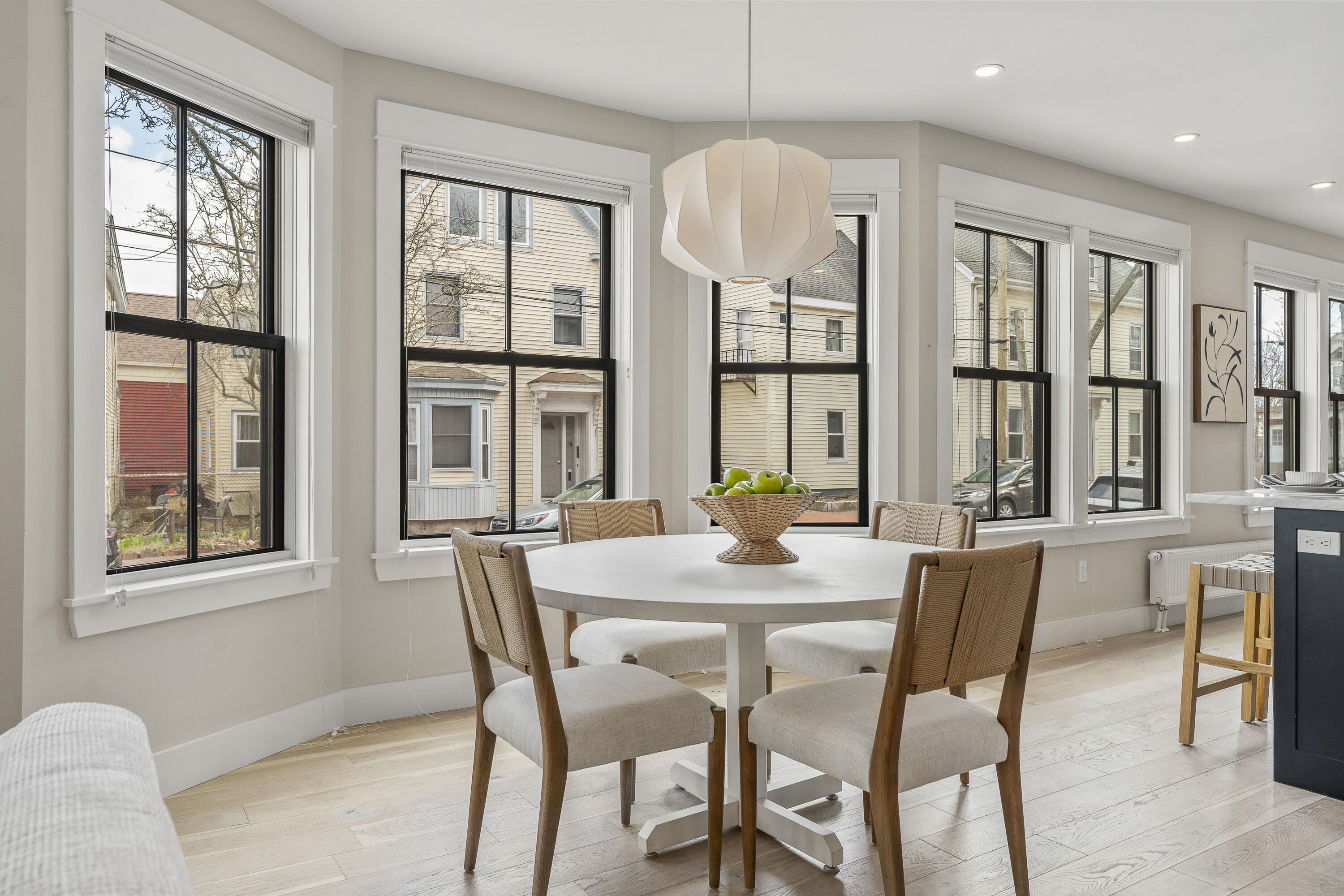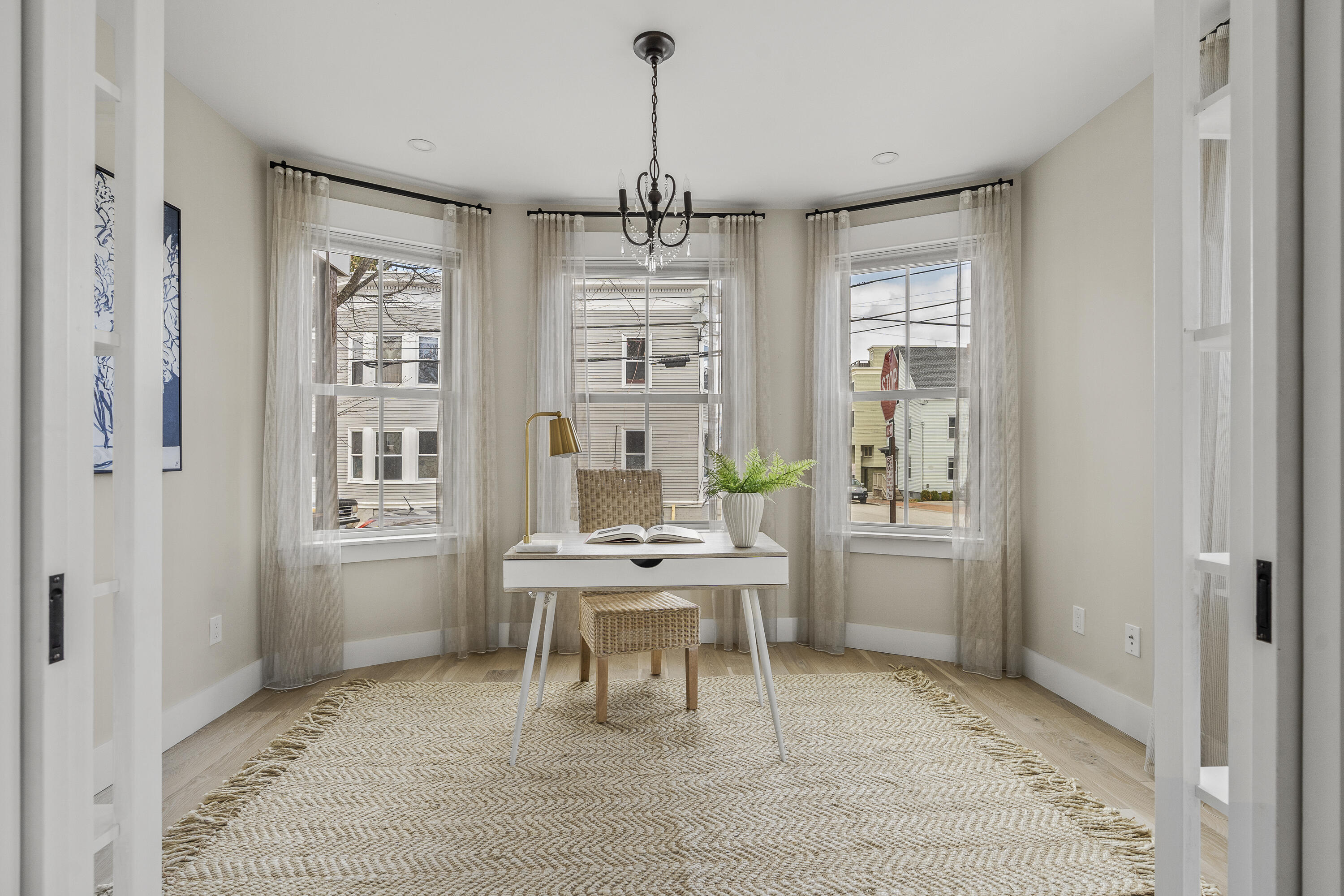 Gracing the top of Munjoy Hill, this condo offers a connection to the city's most beloved amenities and a lifestyle both refined and coastal. It is just moments from celebrated restaurants, neighborhood cafes, the Eastern Promenade, and the sparkling waters of Casco Bay. Originally built with historic character and reimagined in 2018, this condominium balances preserved architectural details with high-end contemporary design. The sun-filled first-floor unit welcomes you with an open layout that connects the living, dining, and kitchen areas. A wall of windows brings in abundant natural light, while a private enclosed deck offers a peaceful outdoor retreat. The kitchen is both striking and functional, featuring rich blue cabinetry, open shelving, a herringbone tile backsplash, a large island with seating for four, and generous storage. Off the living room, pocket doors reveal a charming library nook with floor-to-ceiling bookshelves and a grand bowed window--a serene spot to read or unwind. The primary suite is a sanctuary with elegant wallpaper, deck access, and a spa-like ensuite bath. A second ensuite bedroom provides comfort and privacy for guests, while the powder room adds a designer touch with bold, modern wallpaper. Additional amenities include in-unit laundry, dedicated & off-street parking, and a private storage area. Luxury, convenience, and timeless design converge in this distinctive Munjoy Hill home--an exceptional opportunity to experience Portland living at its finest.