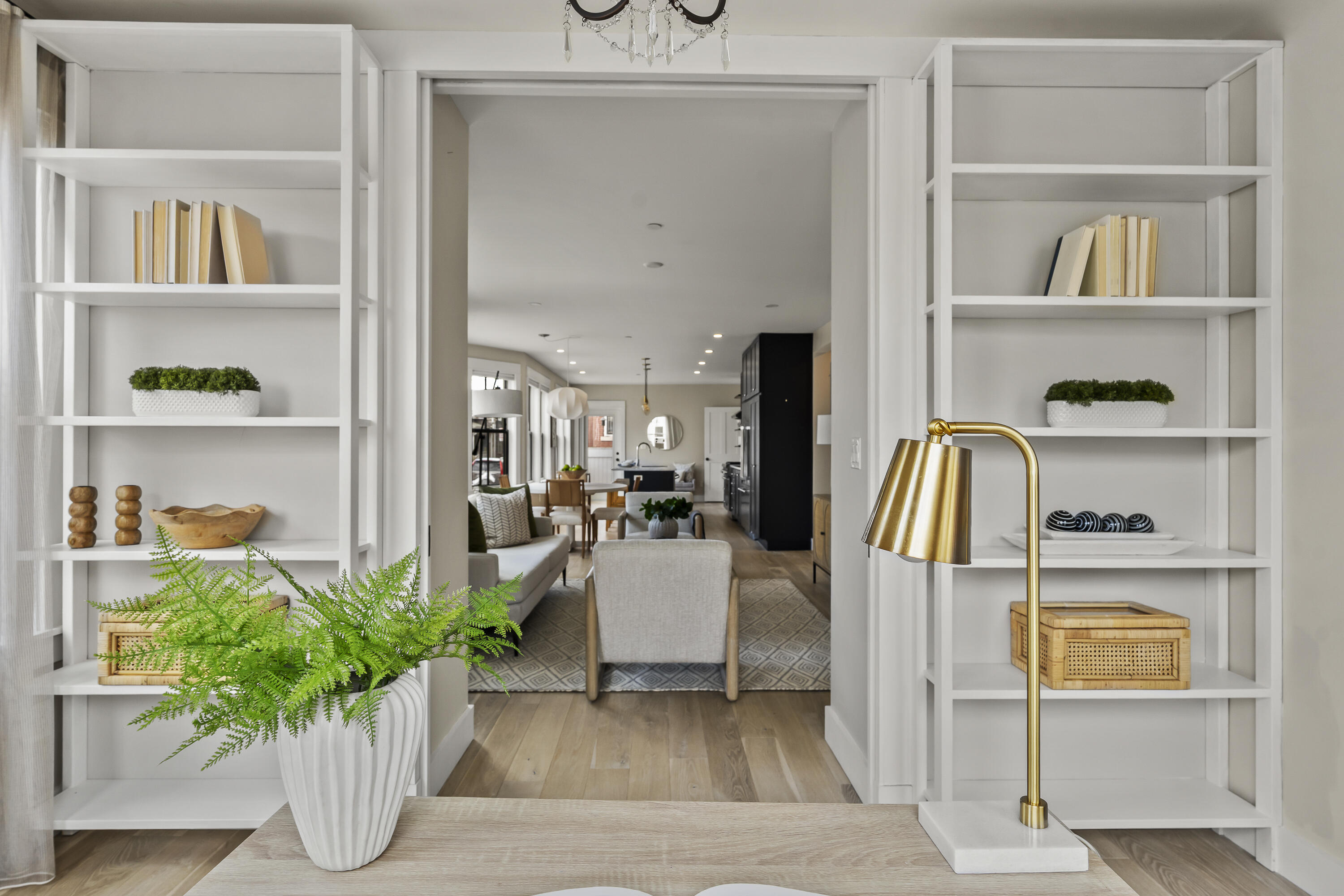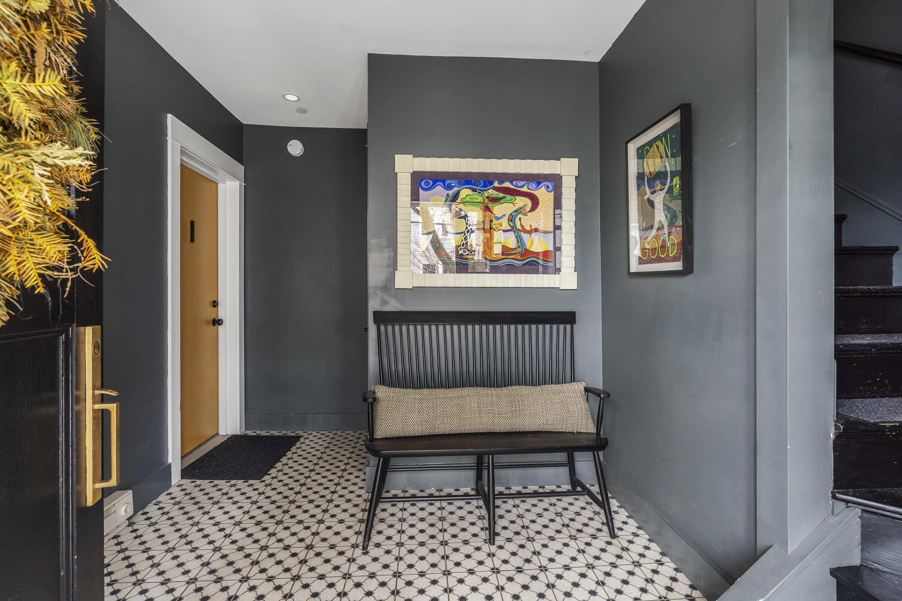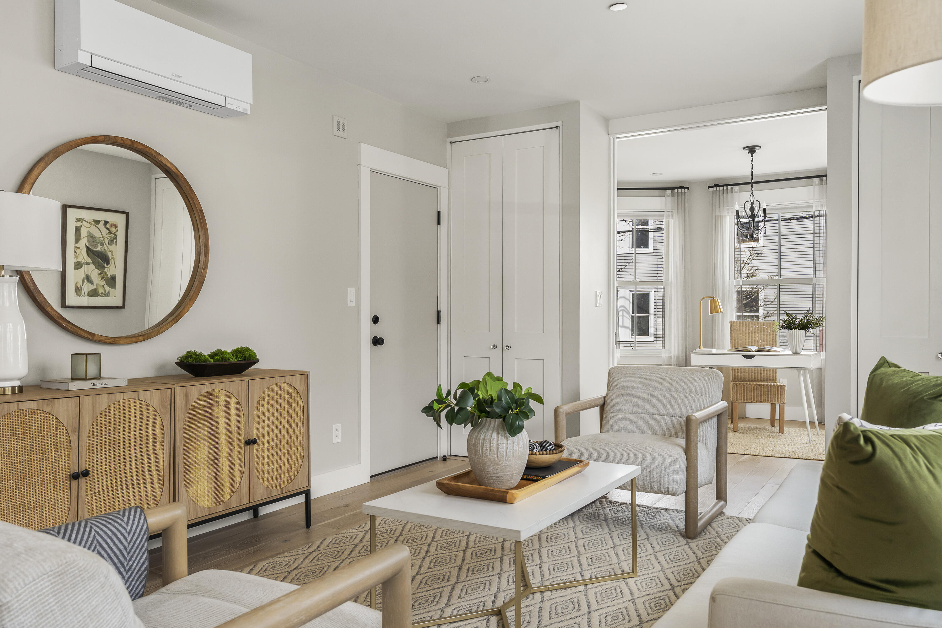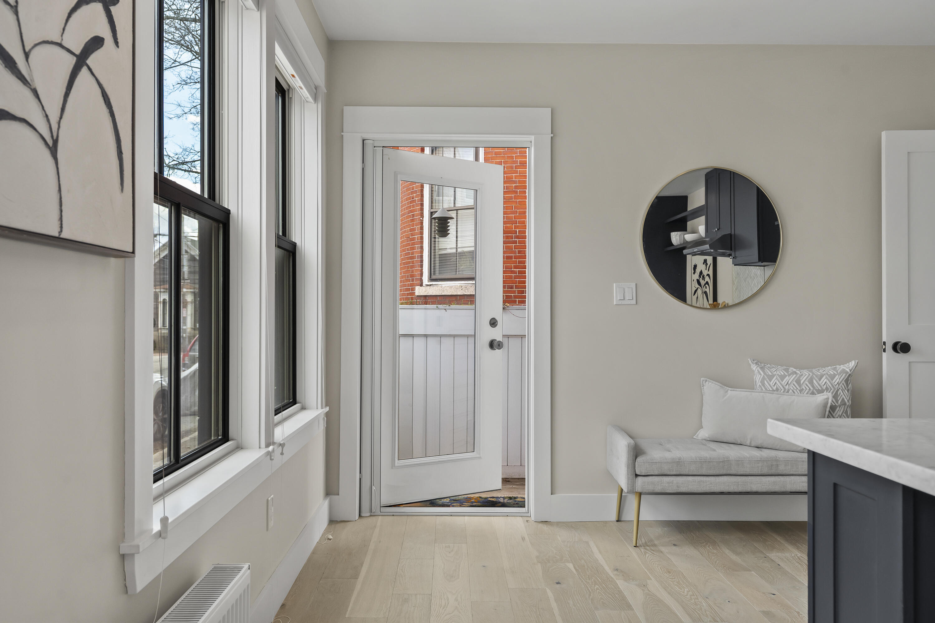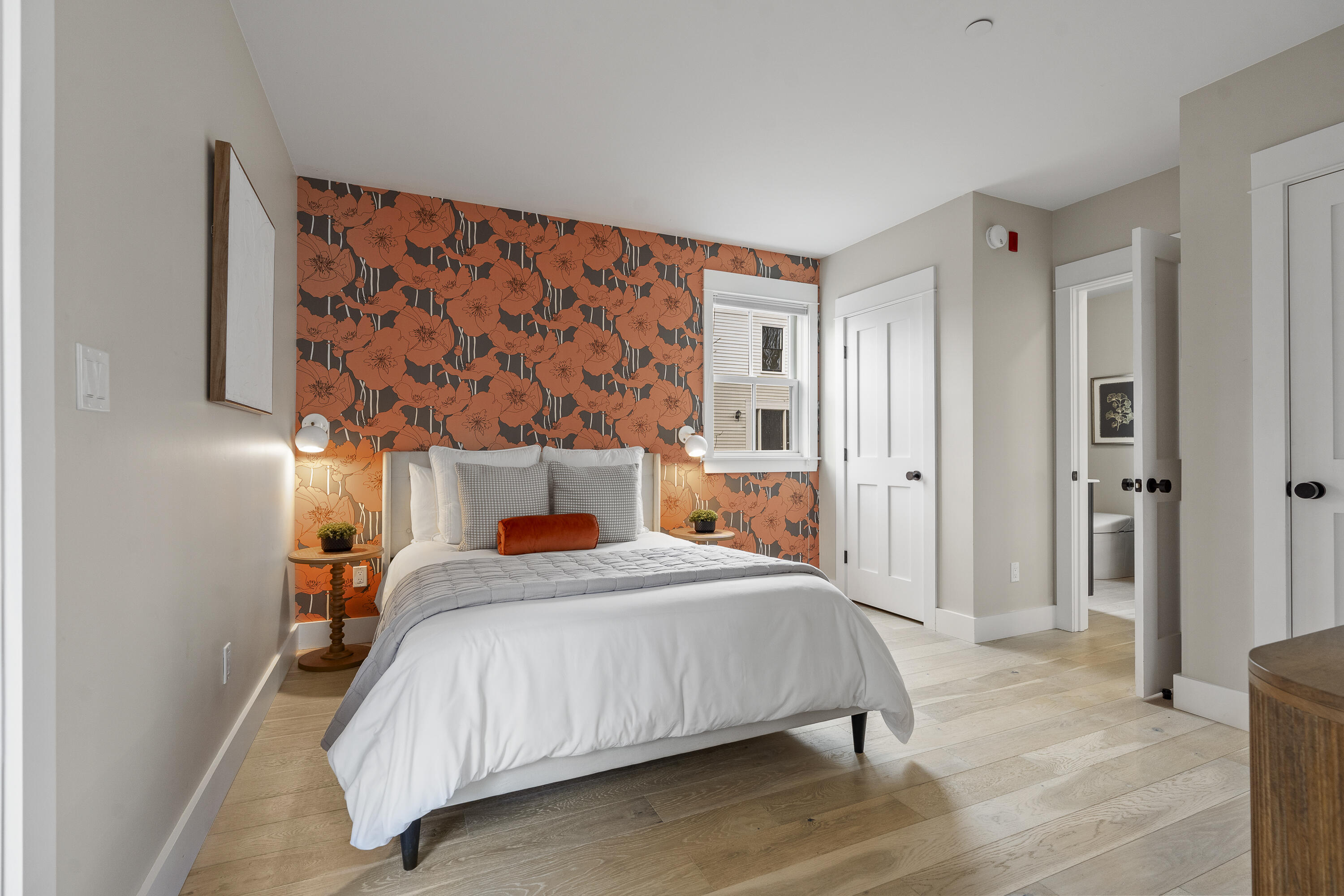 Gracing the top of Munjoy Hill, this condo offers a connection to the city's most beloved amenities and a lifestyle both refined and coastal. It is just moments from celebrated restaurants, neighborhood cafes, the Eastern Promenade, and the sparkling waters of Casco Bay. Originally built with historic character and reimagined in 2018, this condominium balances preserved architectural details with high-end contemporary design. The sun-filled first-floor unit welcomes you with an open layout that connects the living, dining, and kitchen areas. A wall of windows brings in abundant natural light, while a private enclosed deck offers a peaceful outdoor retreat. The kitchen is both striking and functional, featuring rich blue cabinetry, open shelving, a herringbone tile backsplash, a large island with seating for four, and generous storage. Off the living room, pocket doors reveal a charming library nook with floor-to-ceiling bookshelves and a grand bowed window--a serene spot to read or unwind. The primary suite is a sanctuary with elegant wallpaper, deck access, and a spa-like ensuite bath. A second ensuite bedroom provides comfort and privacy for guests, while the powder room adds a designer touch with bold, modern wallpaper. Additional amenities include in-unit laundry, dedicated & off-street parking, and a private storage area. Luxury, convenience, and timeless design converge in this distinctive Munjoy Hill home--an exceptional opportunity to experience Portland living at its finest.