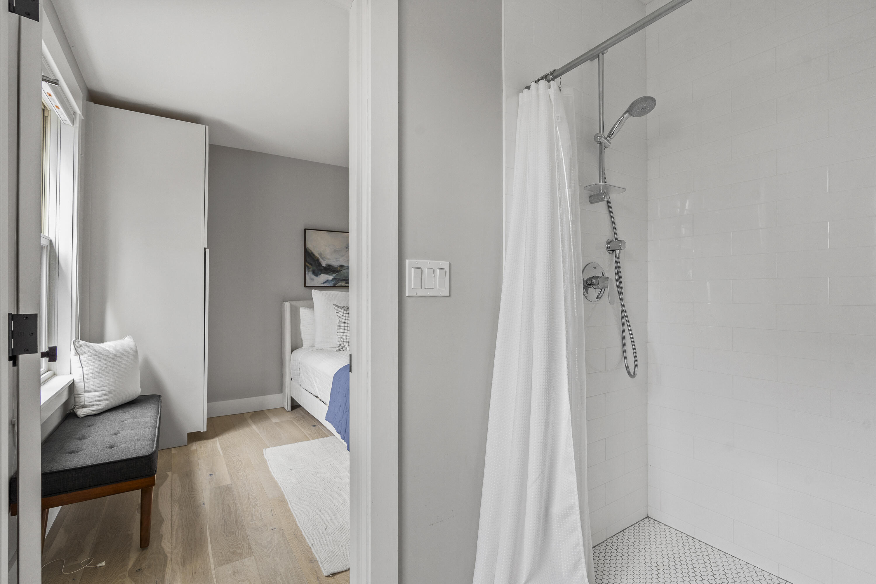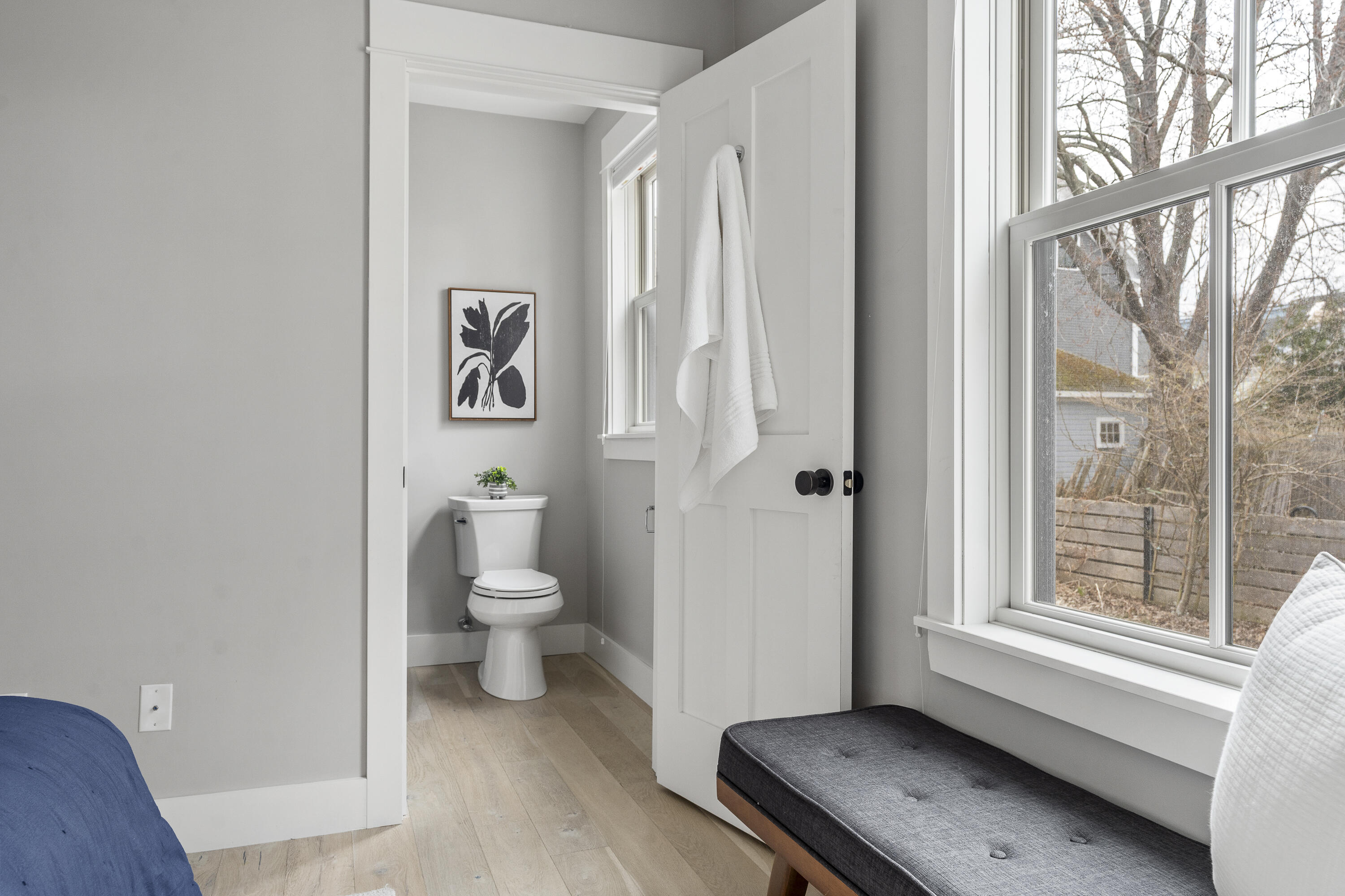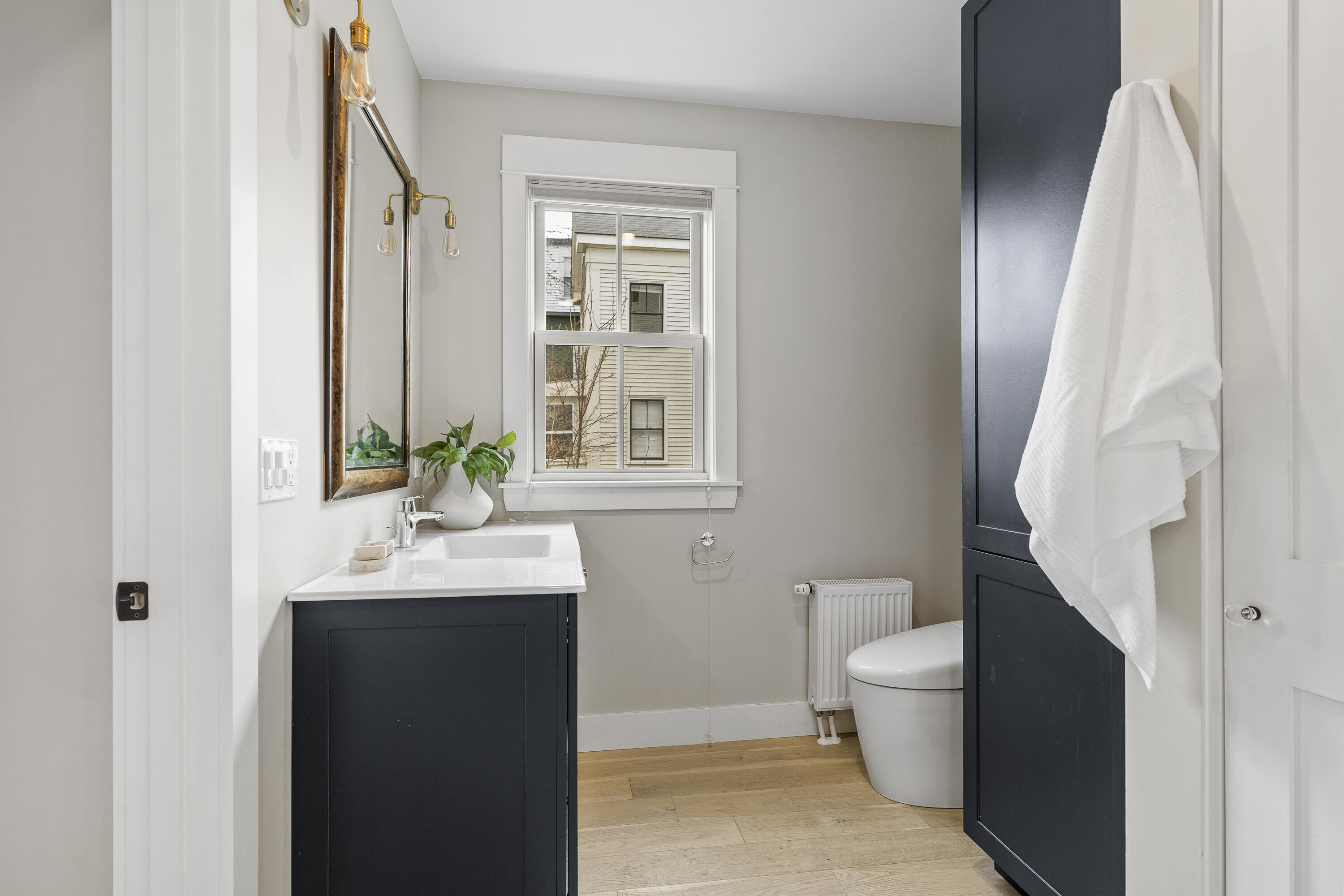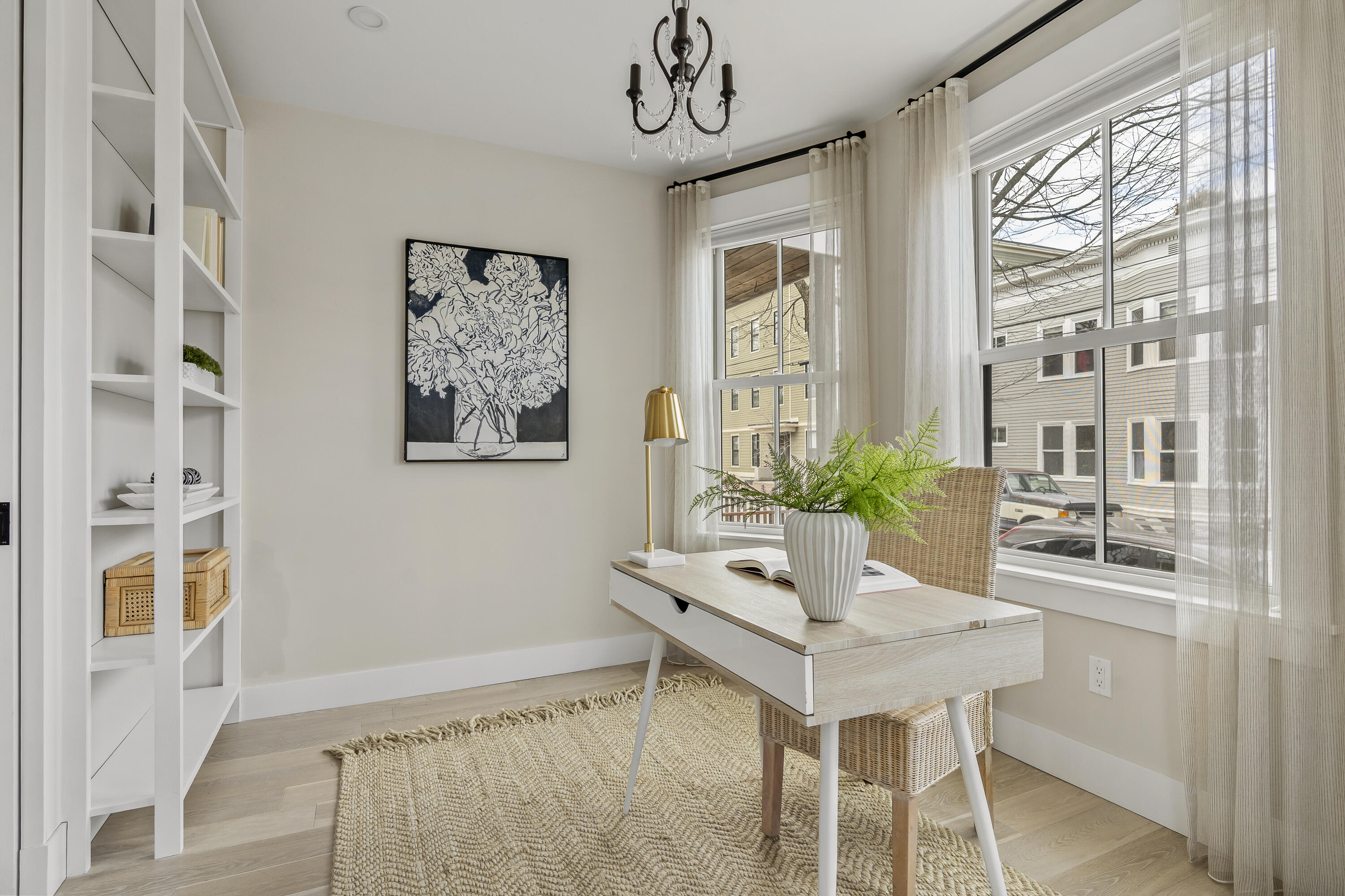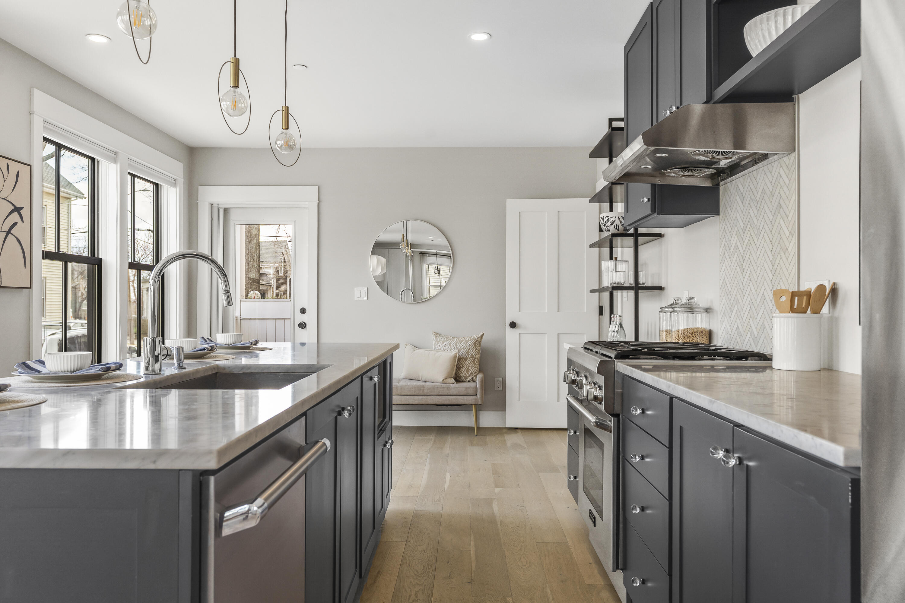 Gracing the top of Munjoy Hill, this condo offers a connection to the city's most beloved amenities and a lifestyle both refined and coastal. It is just moments from celebrated restaurants, neighborhood cafes, the Eastern Promenade, and the sparkling waters of Casco Bay. Originally built with historic character and reimagined in 2018, this condominium balances preserved architectural details with high-end contemporary design. The sun-filled first-floor unit welcomes you with an open layout that connects the living, dining, and kitchen areas. A wall of windows brings in abundant natural light, while a private enclosed deck offers a peaceful outdoor retreat. The kitchen is both striking and functional, featuring rich blue cabinetry, open shelving, a herringbone tile backsplash, a large island with seating for four, and generous storage. Off the living room, pocket doors reveal a charming library nook with floor-to-ceiling bookshelves and a grand bowed window--a serene spot to read or unwind. The primary suite is a sanctuary with elegant wallpaper, deck access, and a spa-like ensuite bath. A second ensuite bedroom provides comfort and privacy for guests, while the powder room adds a designer touch with bold, modern wallpaper. Additional amenities include in-unit laundry, dedicated & off-street parking, and a private storage area. Luxury, convenience, and timeless design converge in this distinctive Munjoy Hill home--an exceptional opportunity to experience Portland living at its finest.